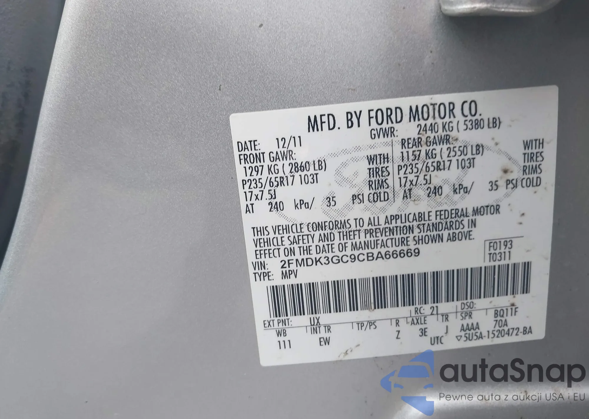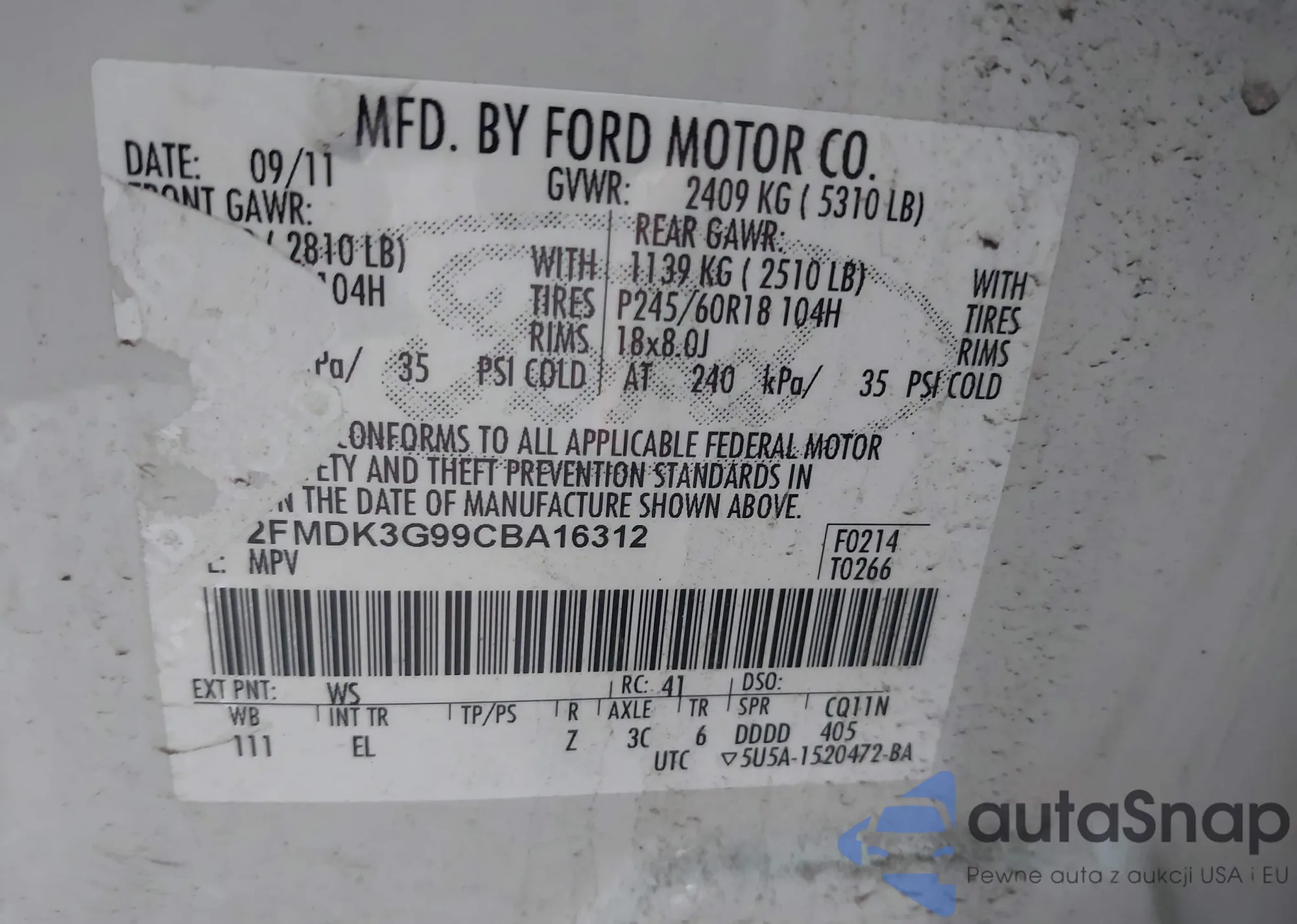 LOT: 42868904 VIN: 2FMDK3G99CBA16312