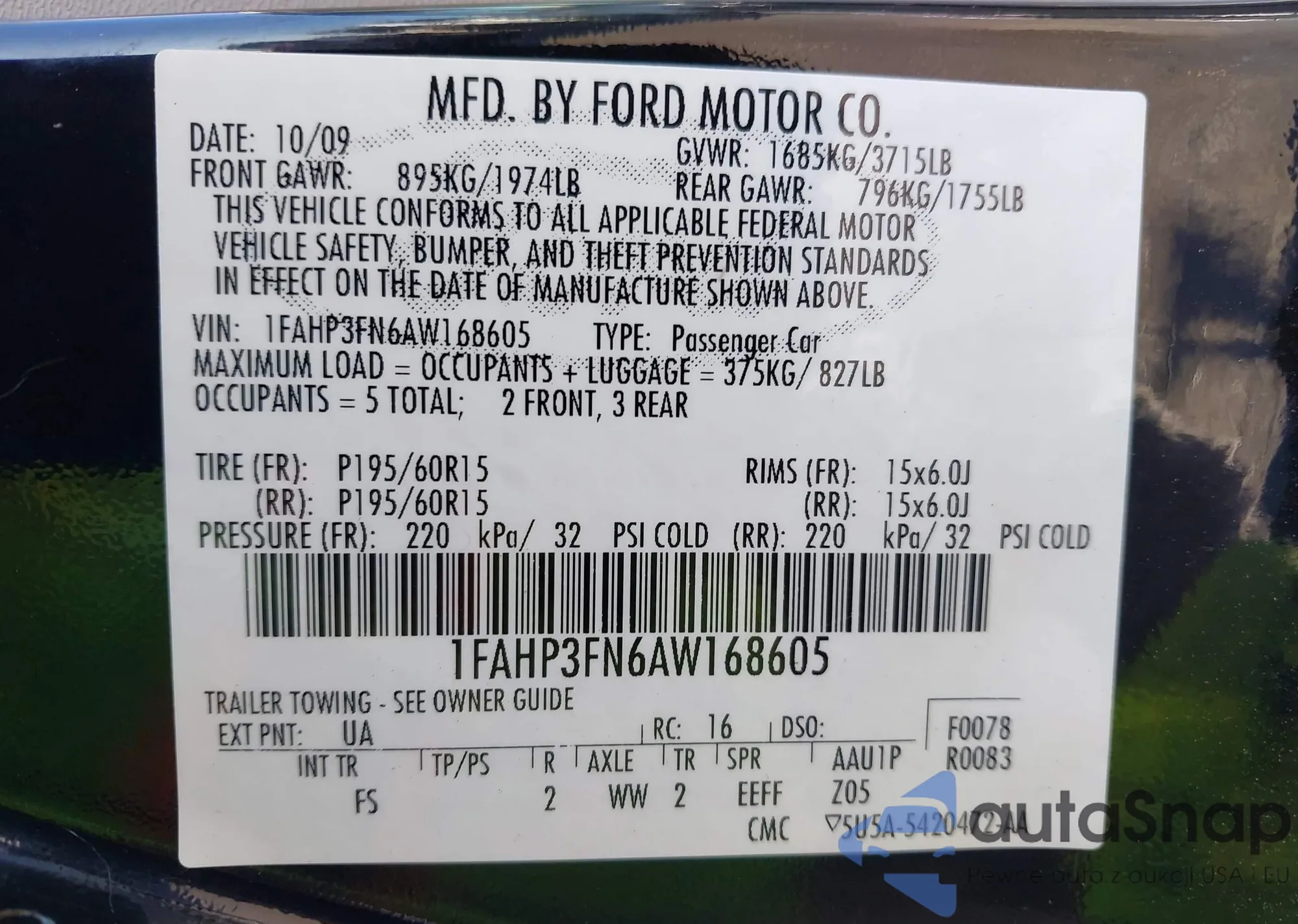 • VIN 1FAHP3FN6AW168605