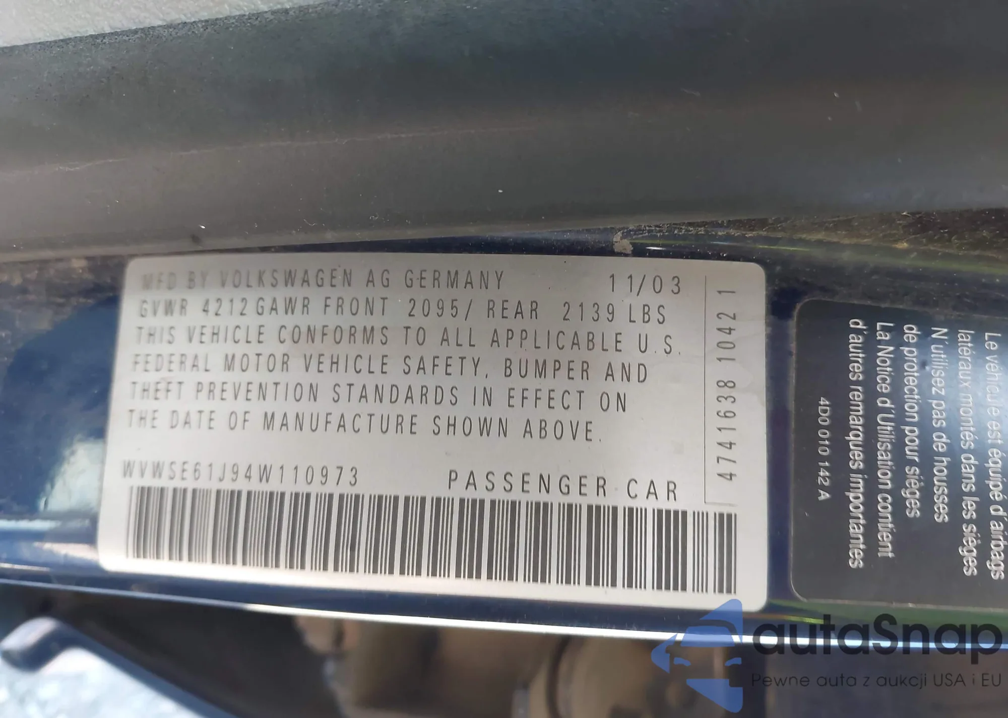 • VIN WVWSE61J94W110973