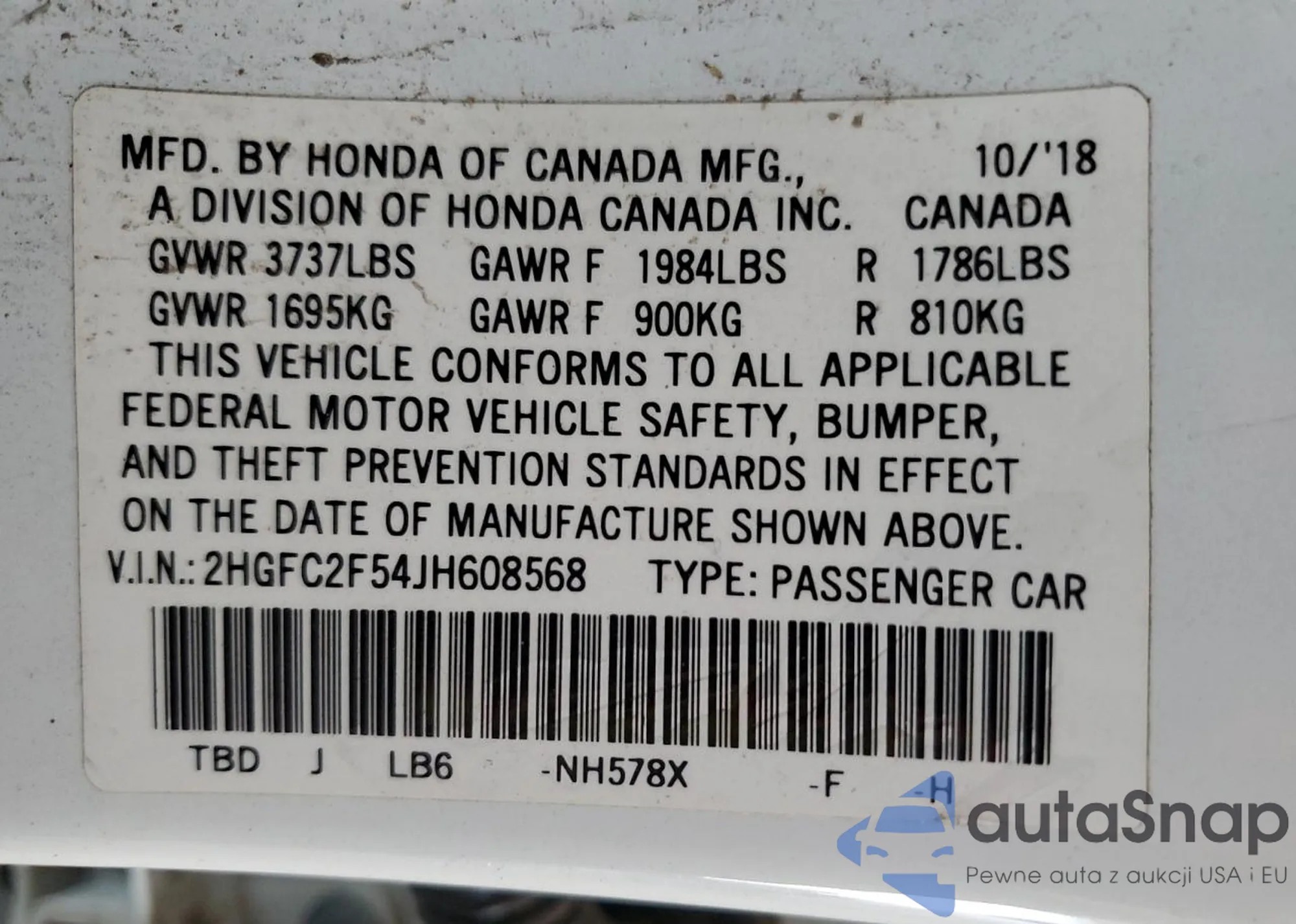 • VIN 2HGFC2F54JH608568