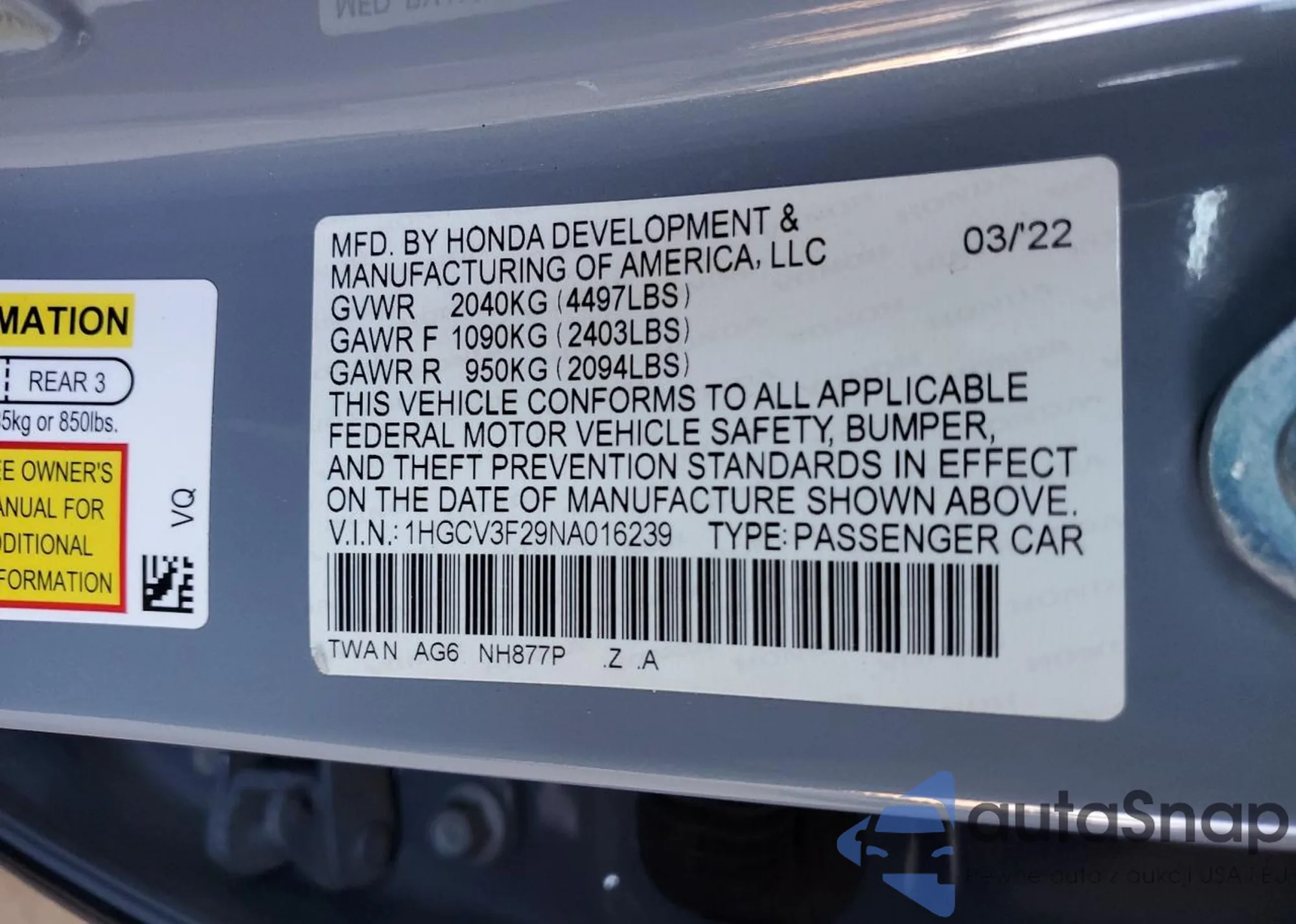 • VIN 1HGCV3F29NA016239