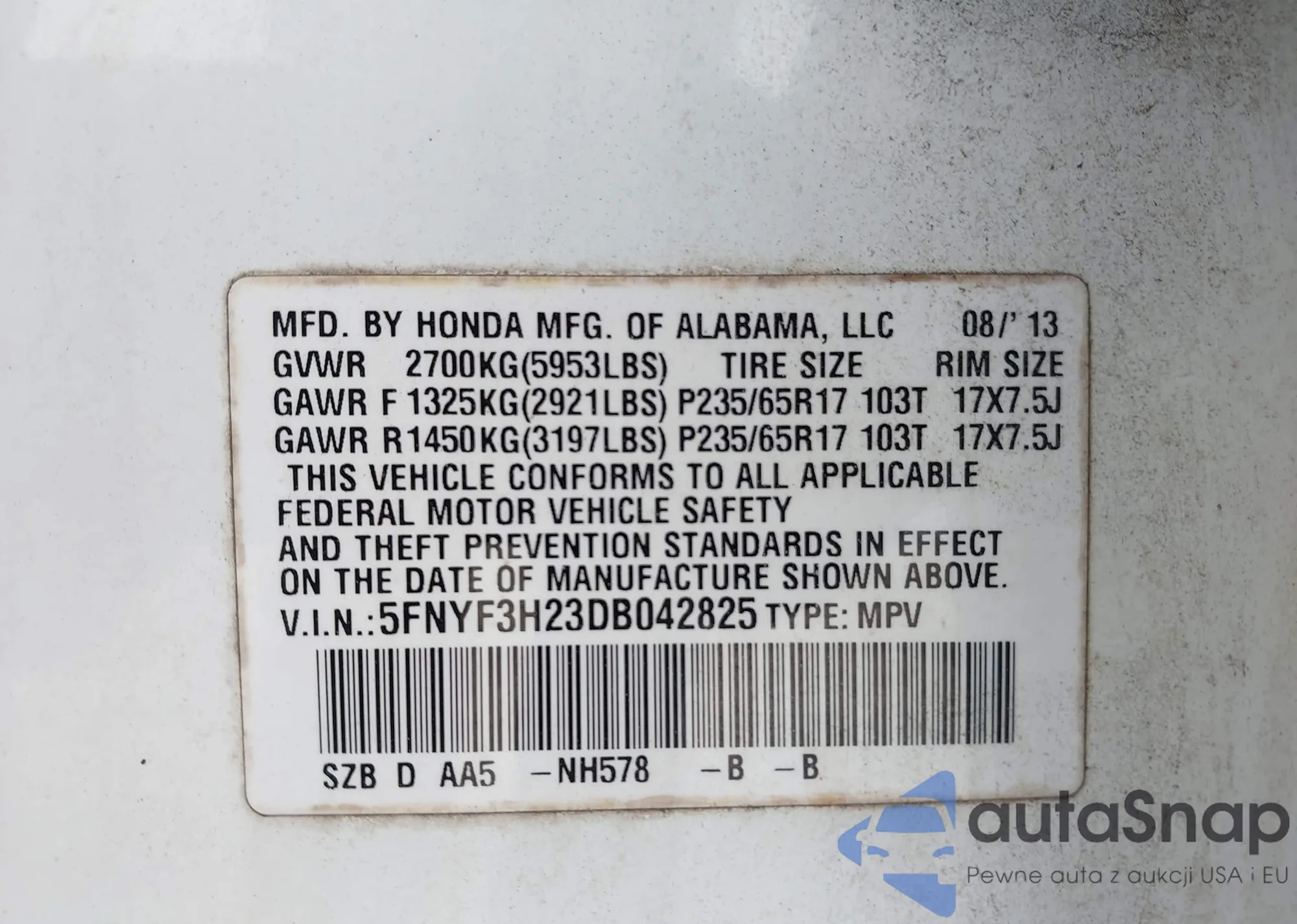 • VIN 5FNYF3H23DB042825