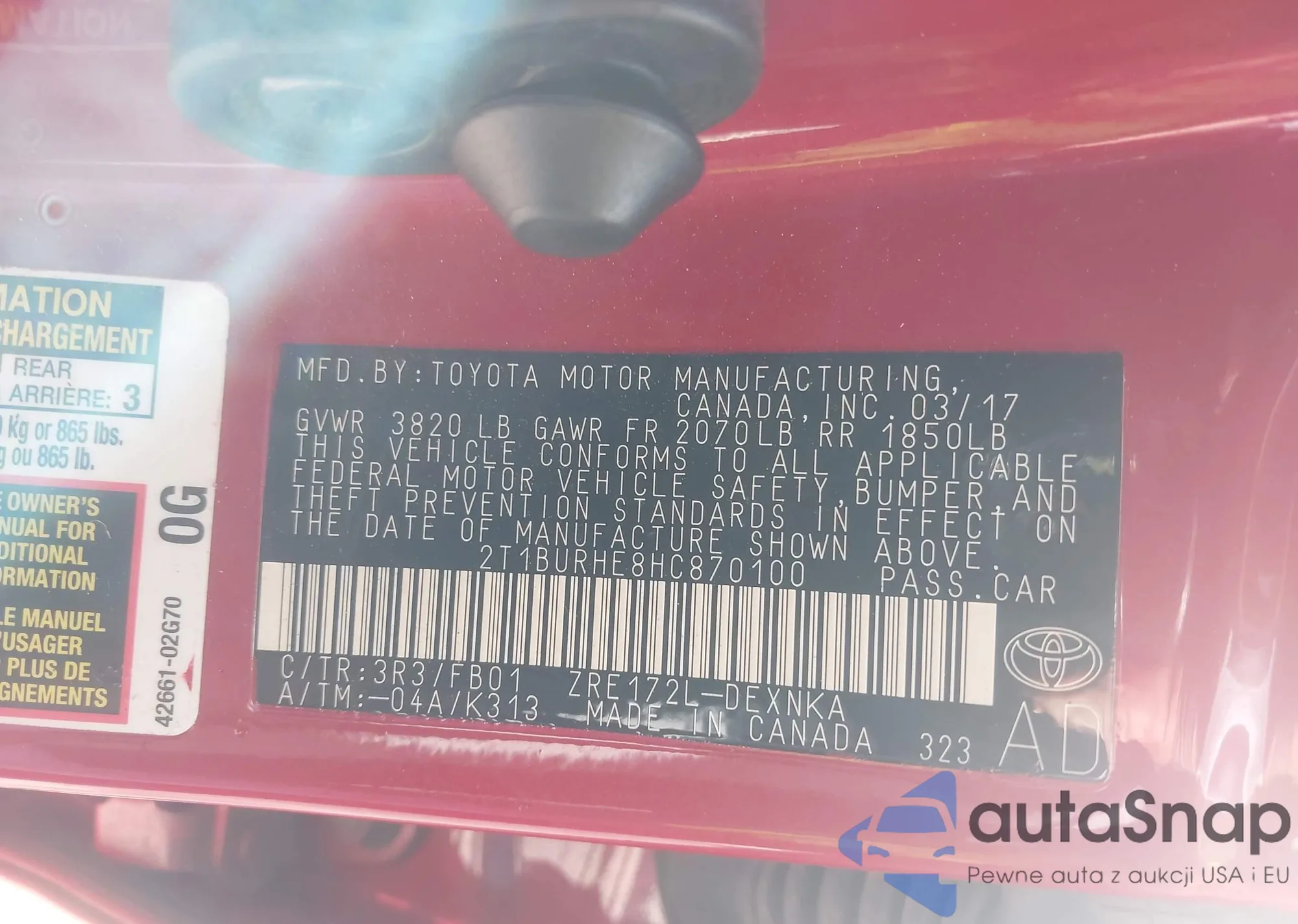 LOT: 42630055 VIN: 2T1BURHE8HC870100