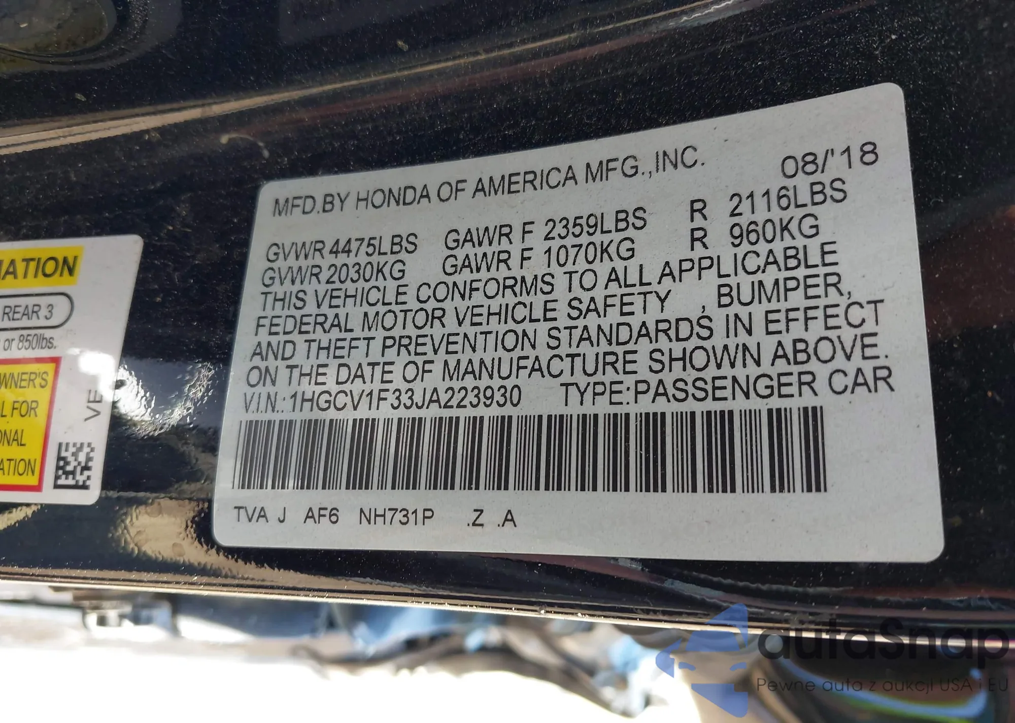 LOT: 42635494 VIN: 1HGCV1F33JA223930
