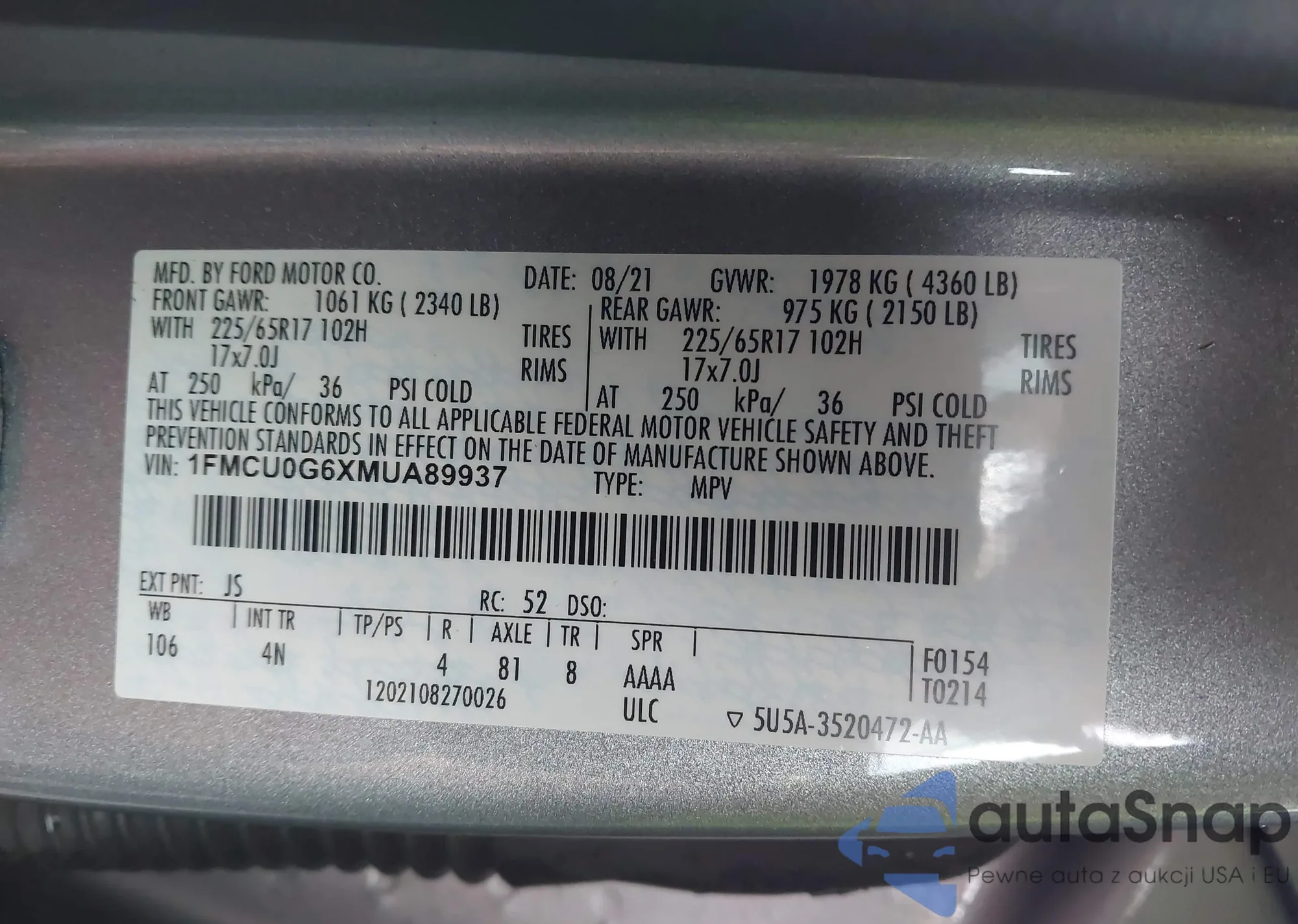 LOT: 42651631 VIN: 1FMCU0G6XMUA89937