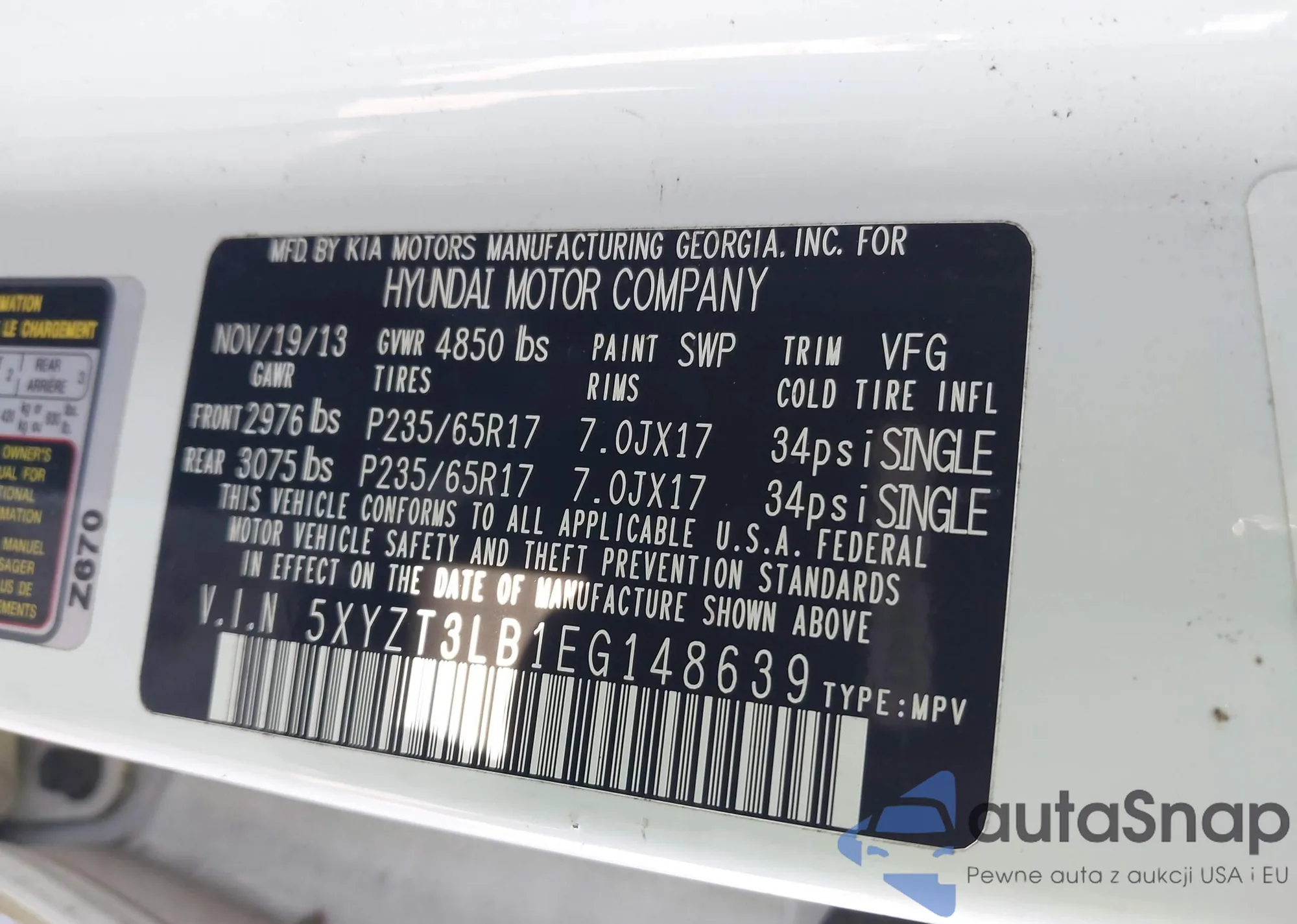 • VIN 5XYZT3LB1EG148639