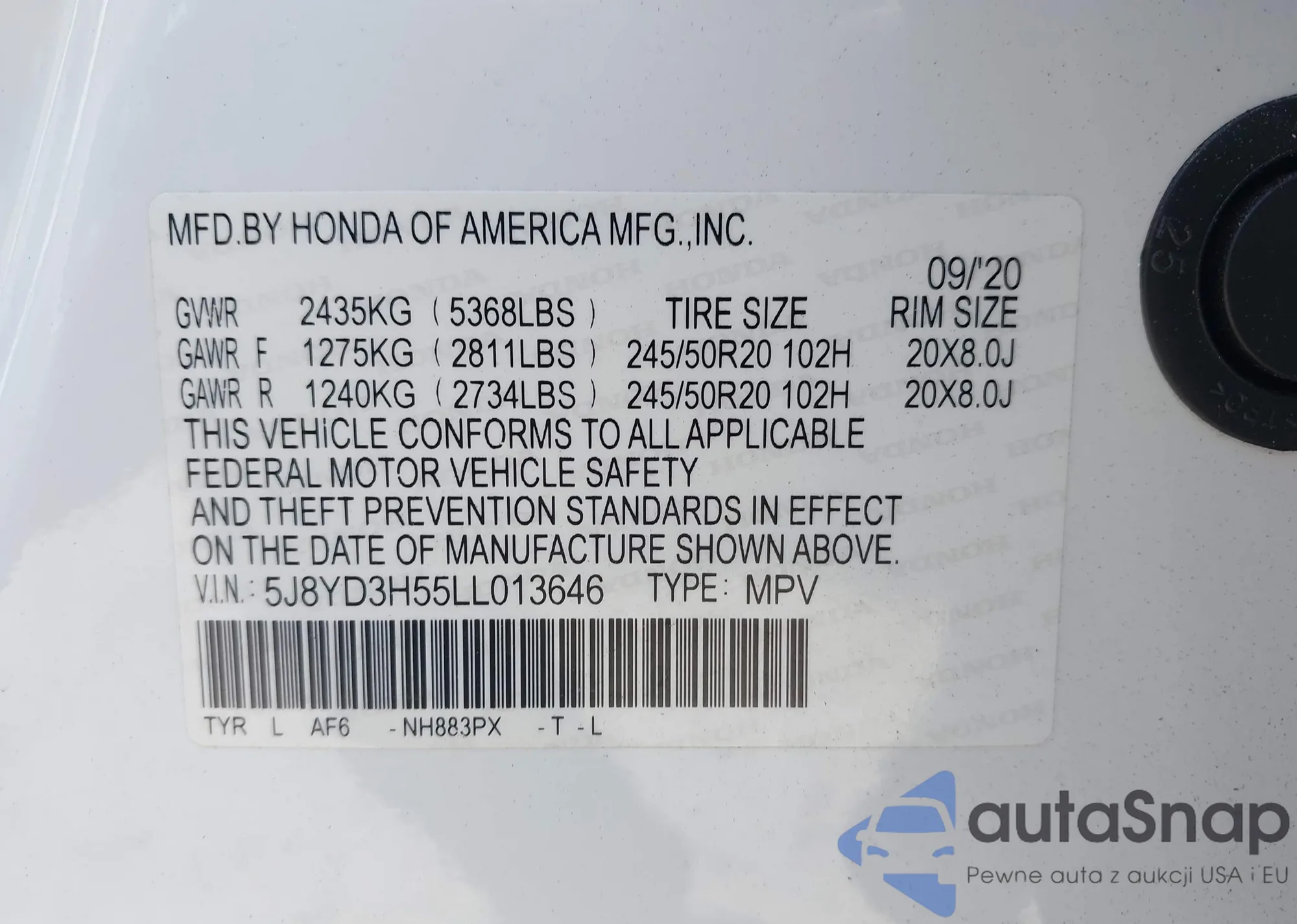 LOT: 42567756 VIN: 5J8YD3H55LL013646