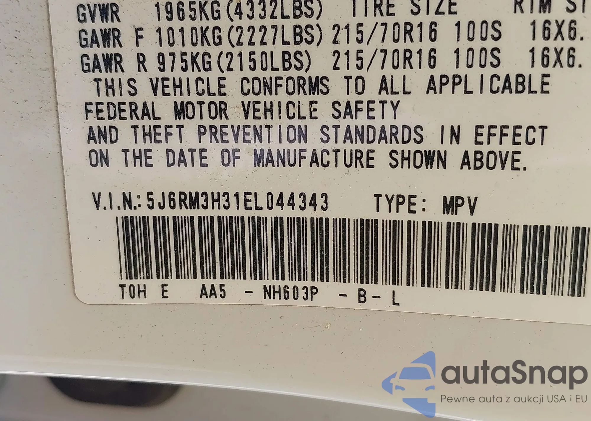 • VIN 5J6RM3H31EL044343
