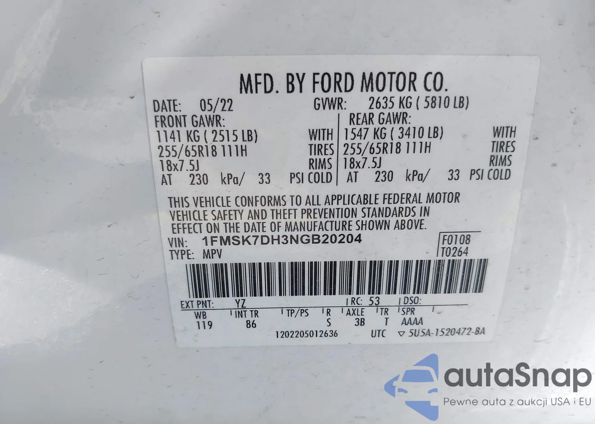 • VIN 1FMSK7DH3NGB20204