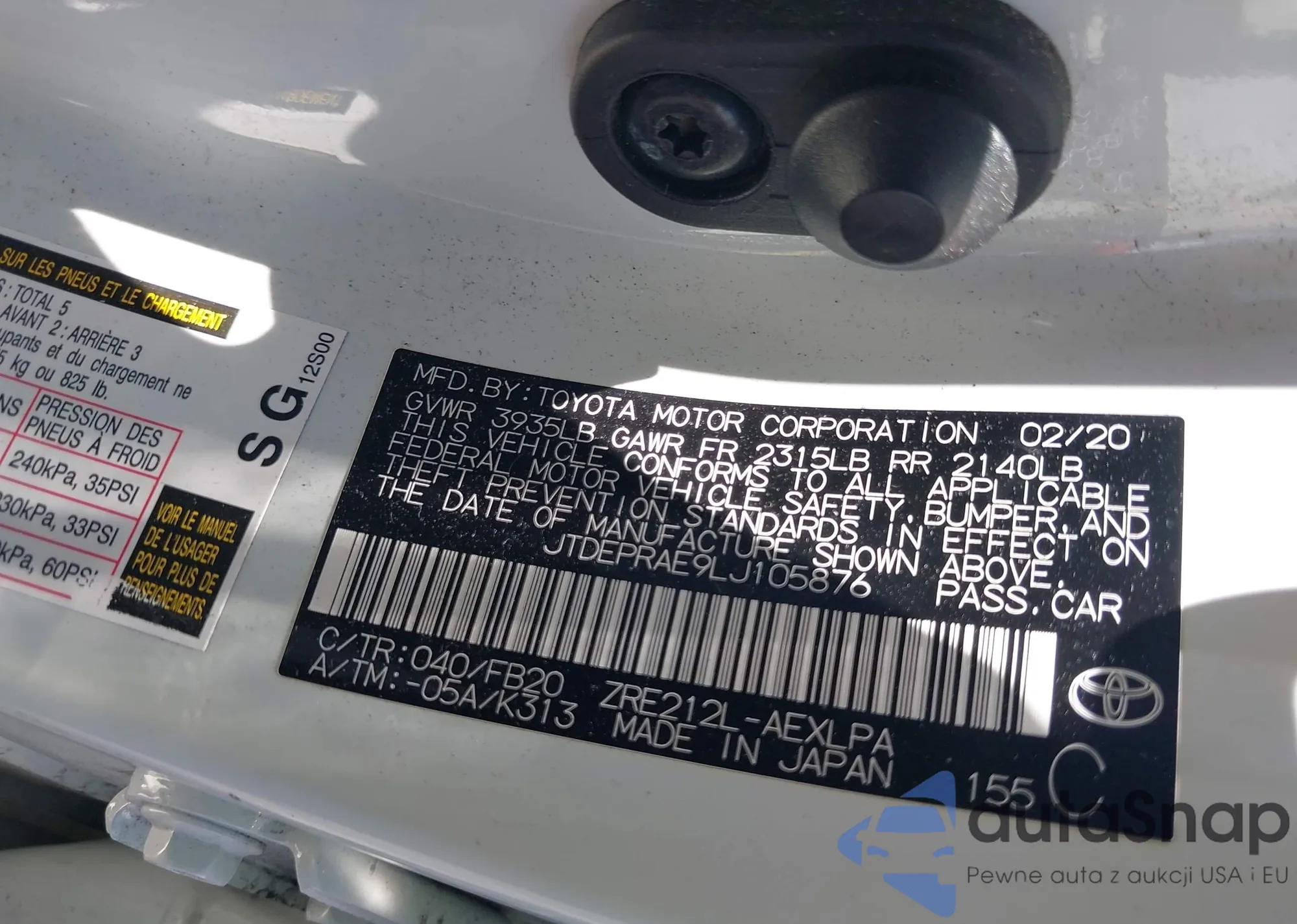 LOT: 42898515 VIN: JTDEPRAE9LJ105876