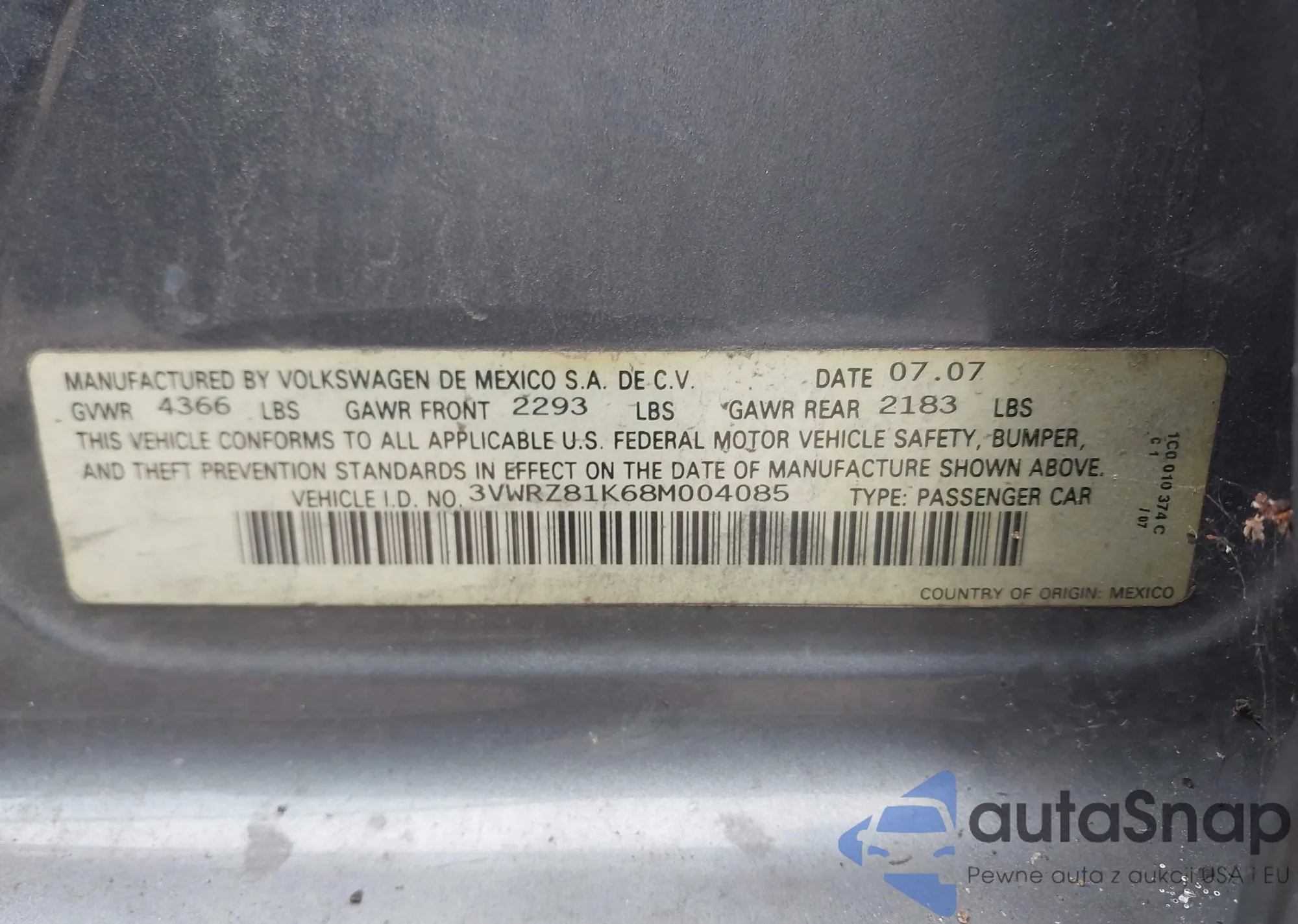• VIN 3VWRZ81K68M004085