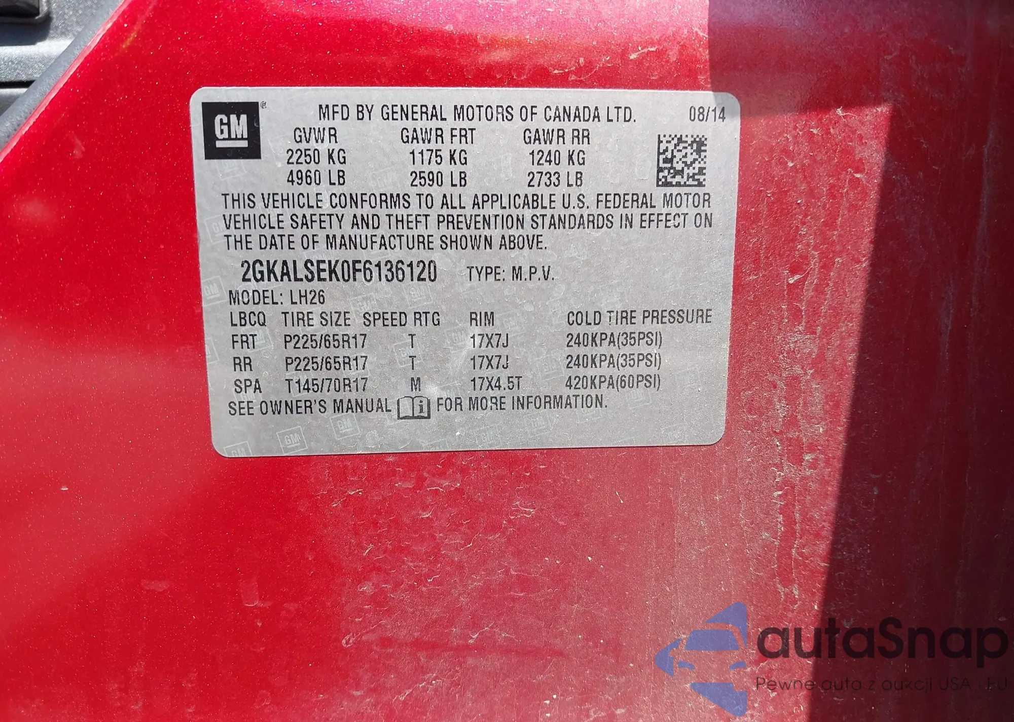 LOT: 43073097 VIN: 2GKALSEK0F6136120