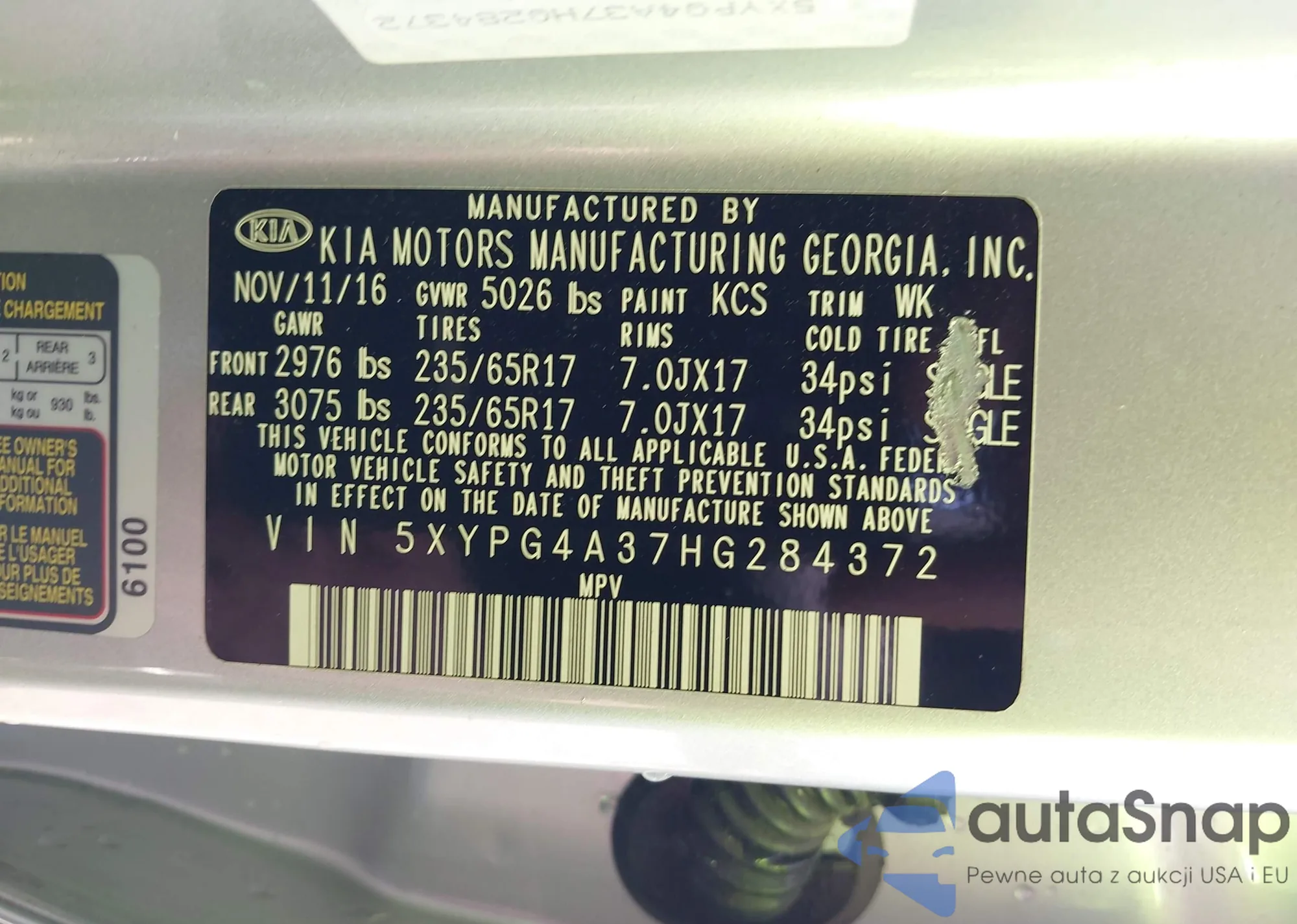 • VIN 5XYPG4A37HG284372