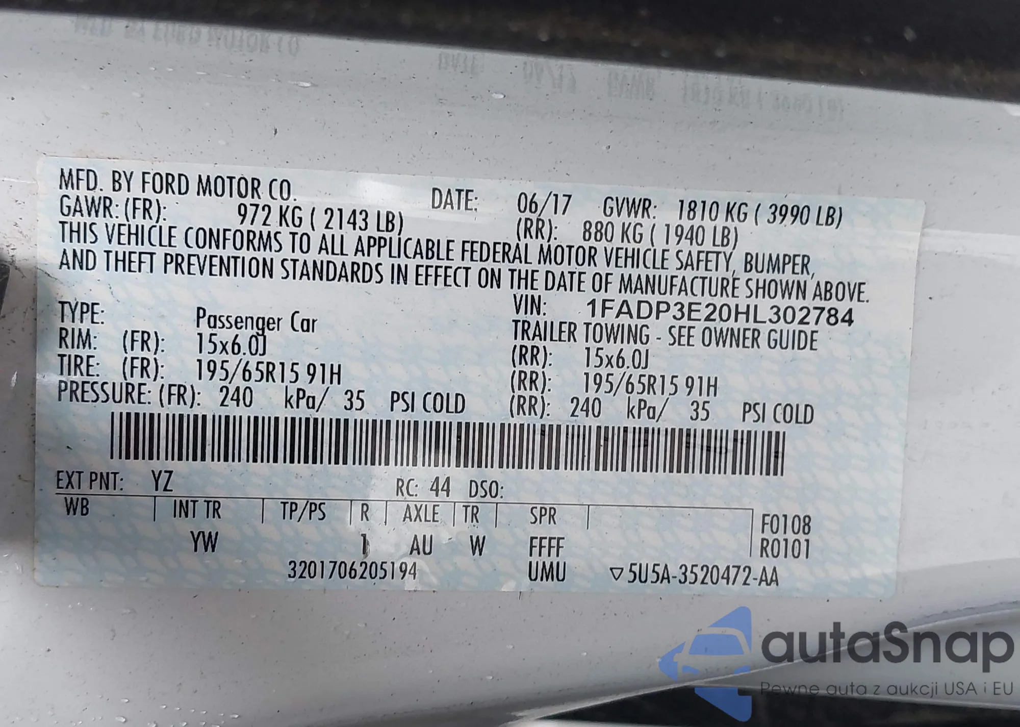 LOT: 42869670 VIN: 1FADP3E20HL302784