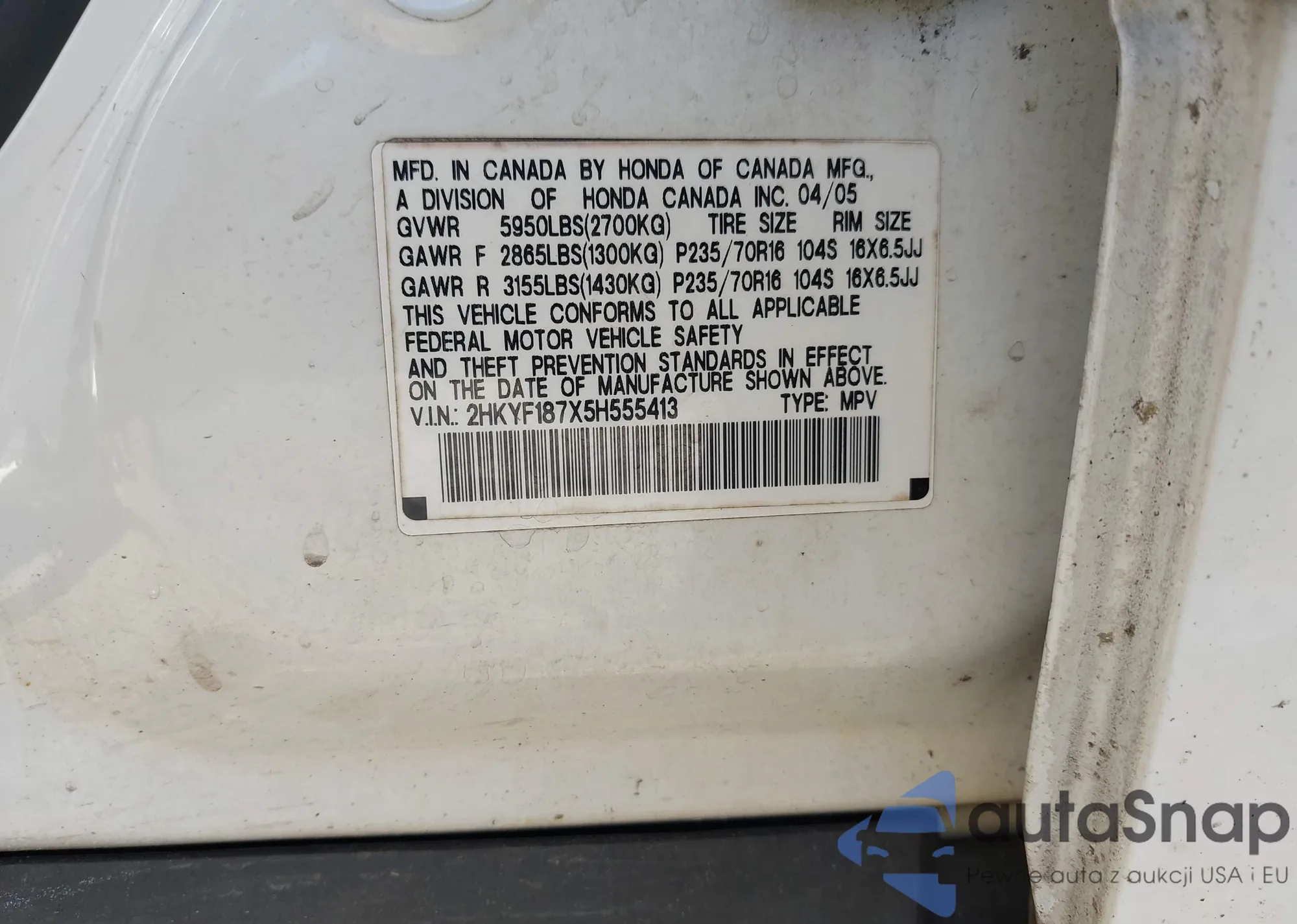 • VIN 2HKYF187X5H555413