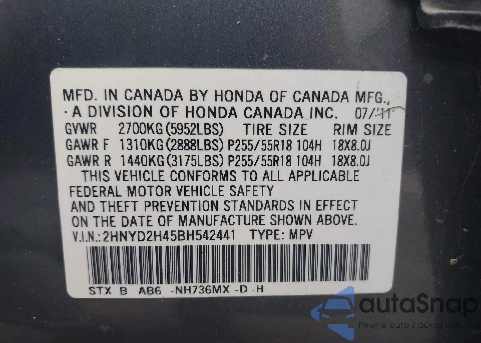 LOT: 42182161 VIN: 2HKYF187X5H555413
