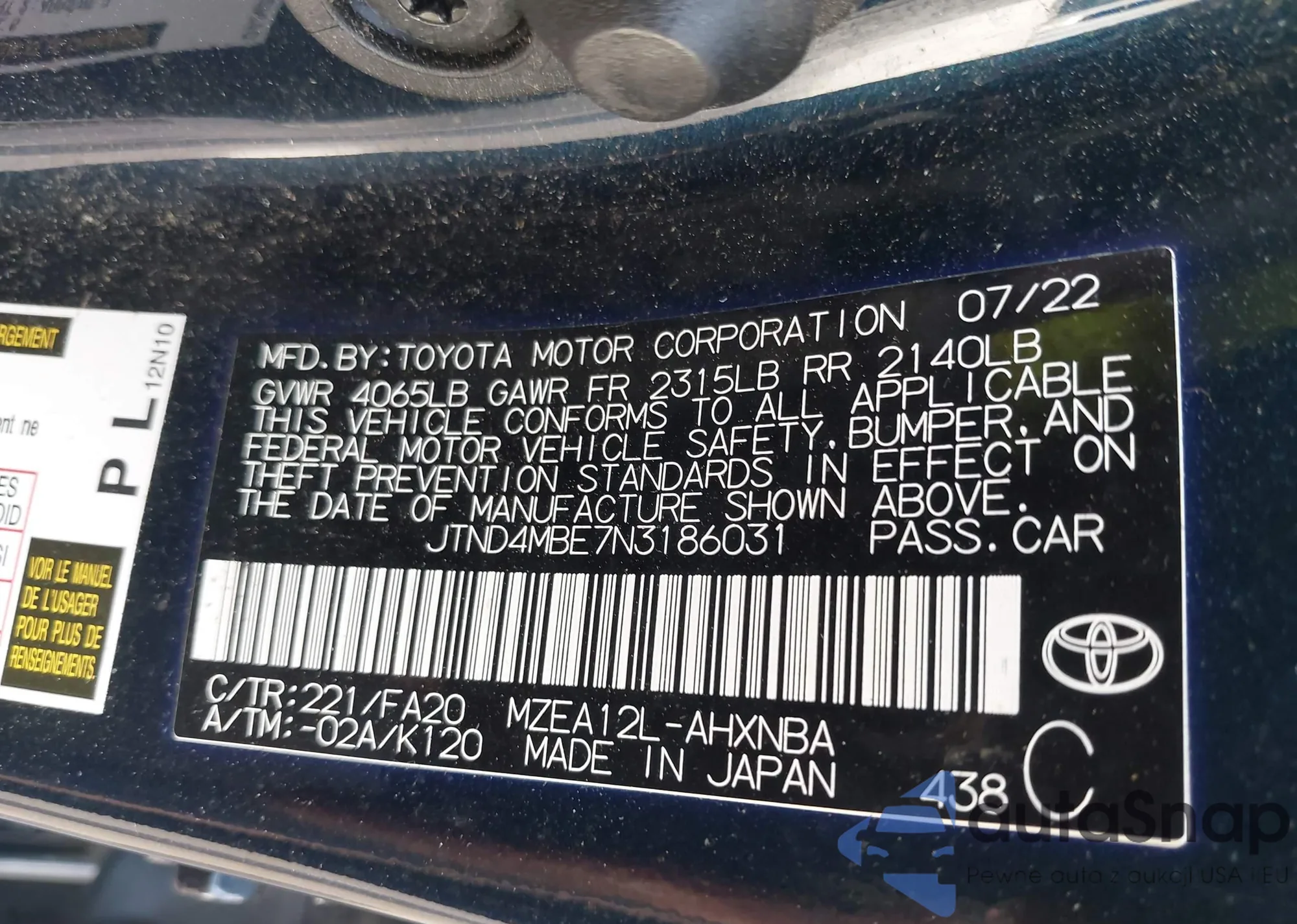 LOT: 42845982 VIN: JTND4MBE7N3186031