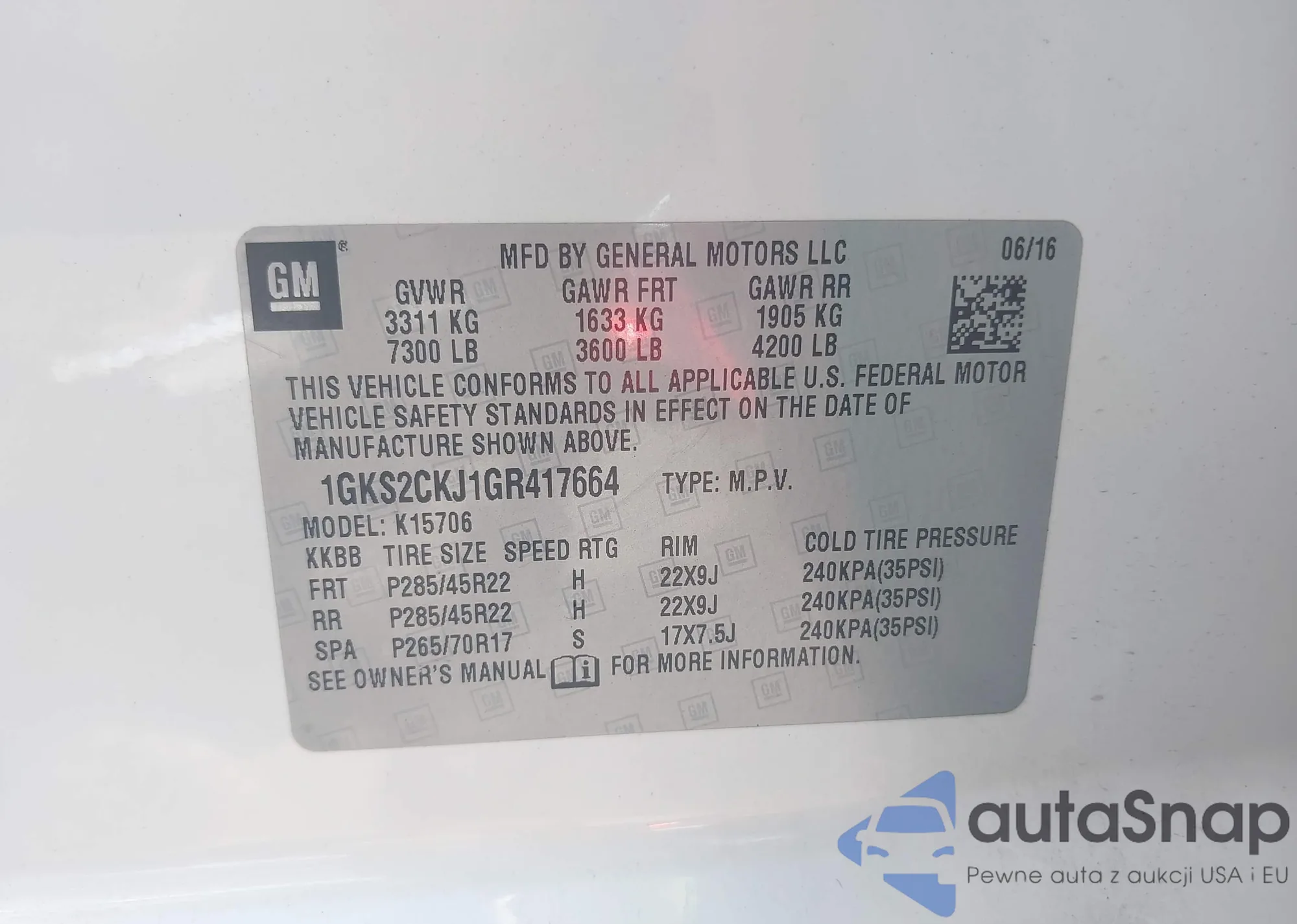LOT: 42679886 VIN: 1GKS2CKJ1GR417664