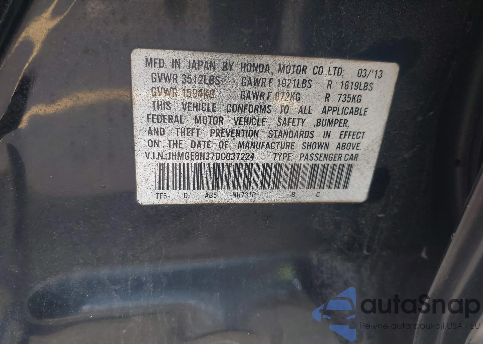 • VIN JHMGE8H37DC037224