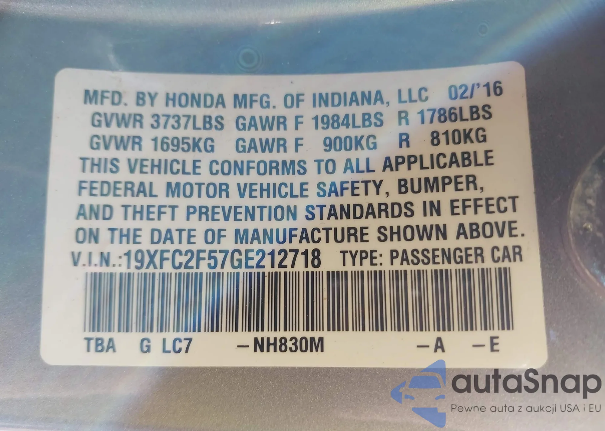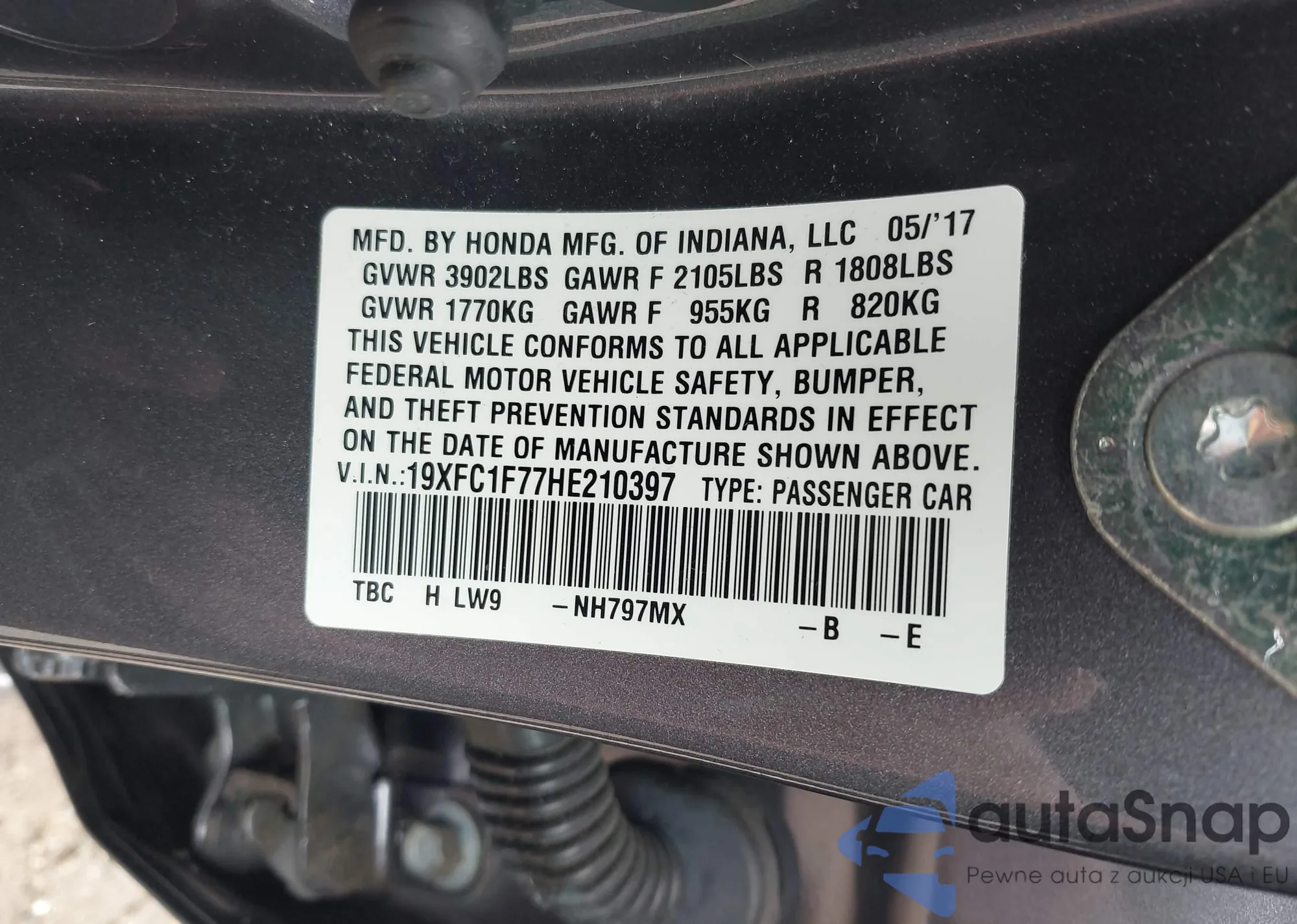 LOT: 43005672 VIN: 19XFC1F77HE210397