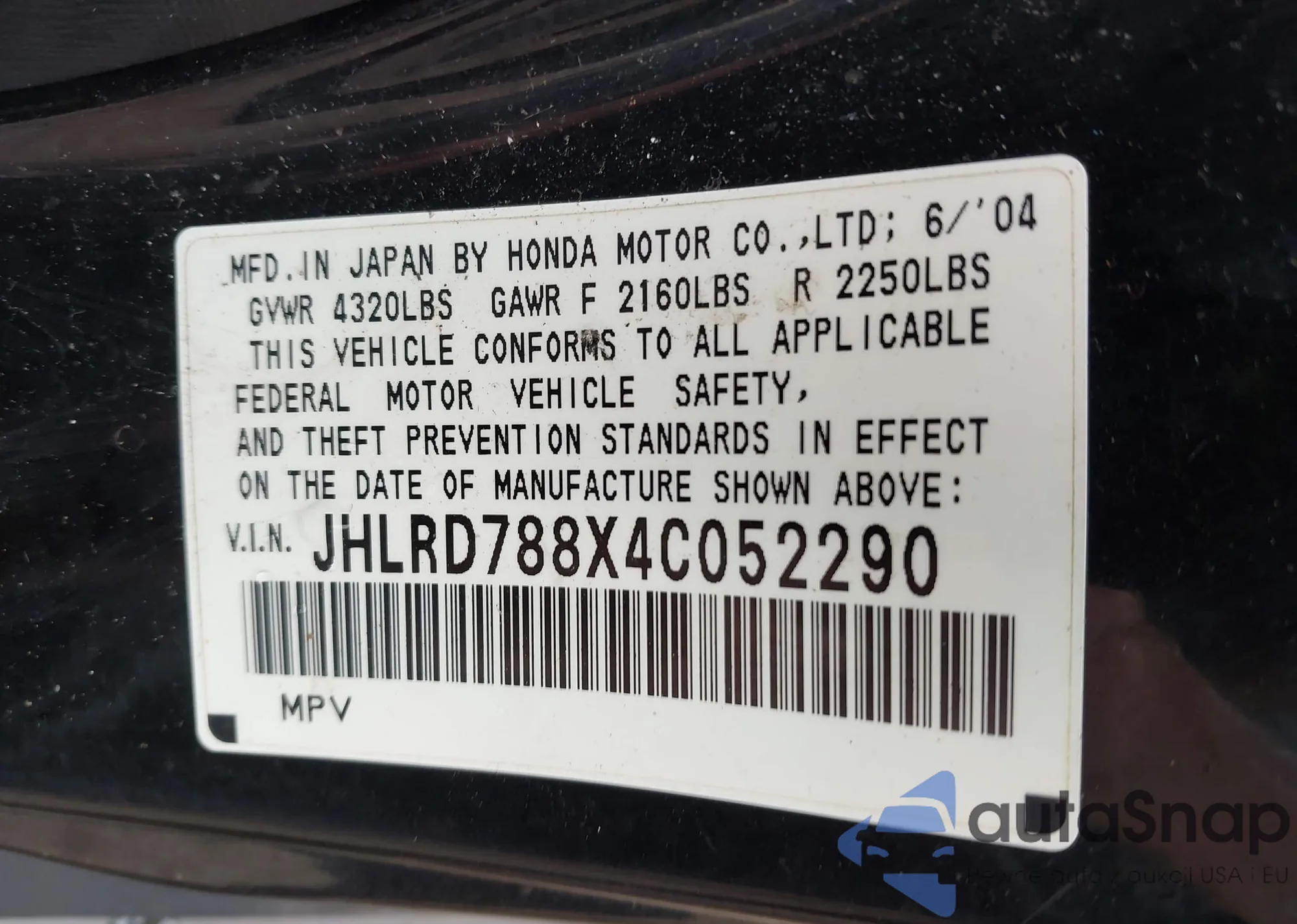 LOT: 42854827 VIN: JHLRD788X4C052290