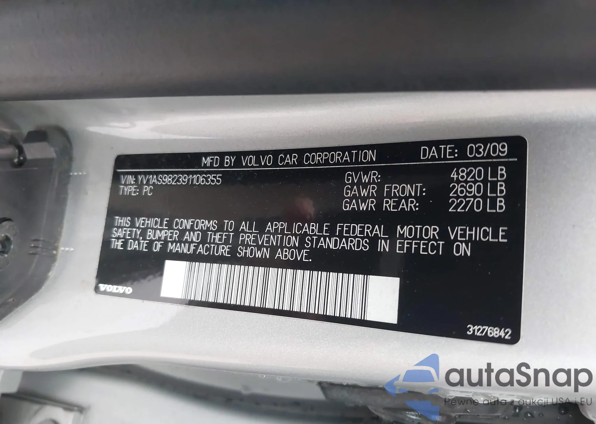 LOT: 42926262 VIN: YV1AS982391106355