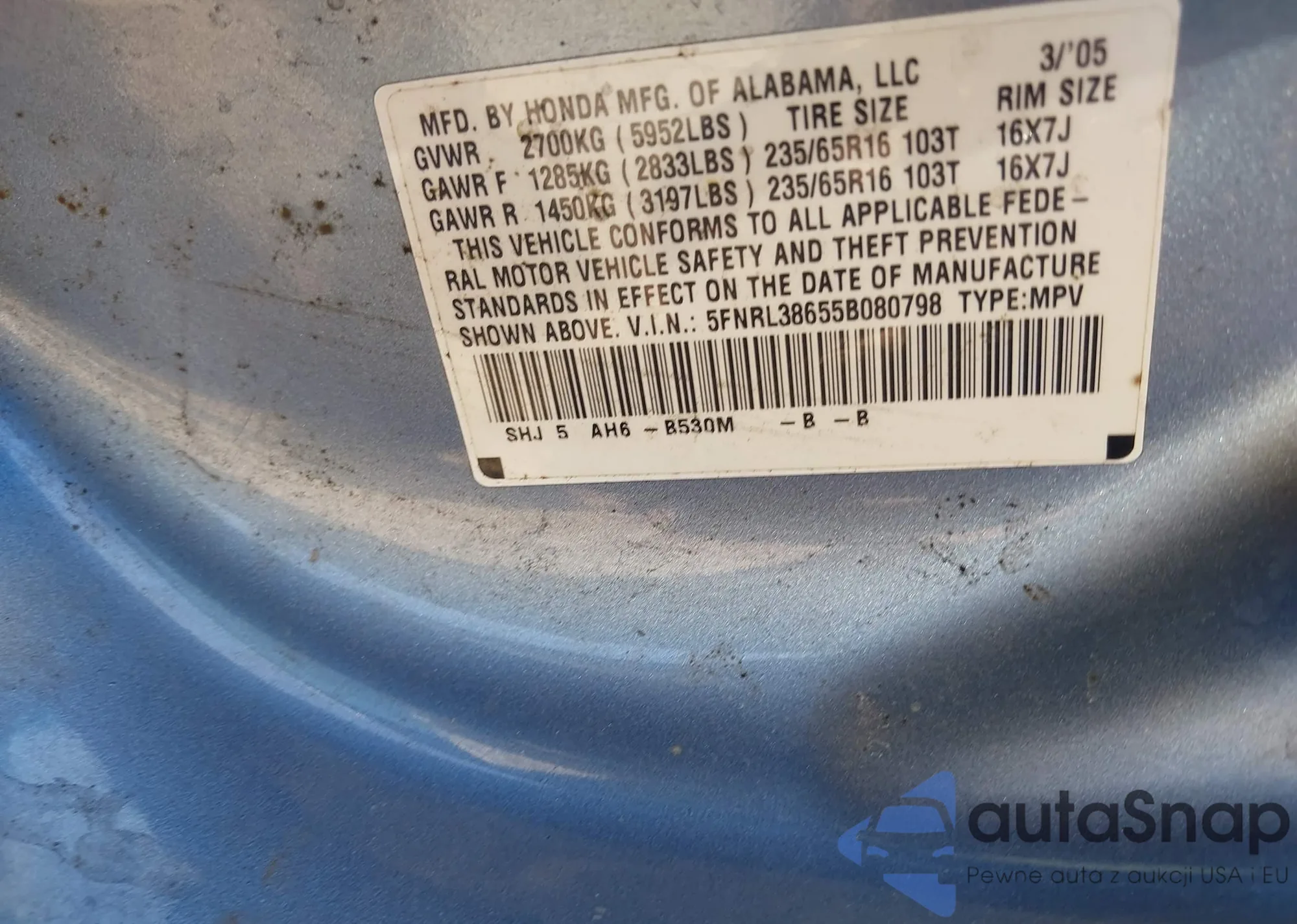 • VIN 5FNRL38655B080798
