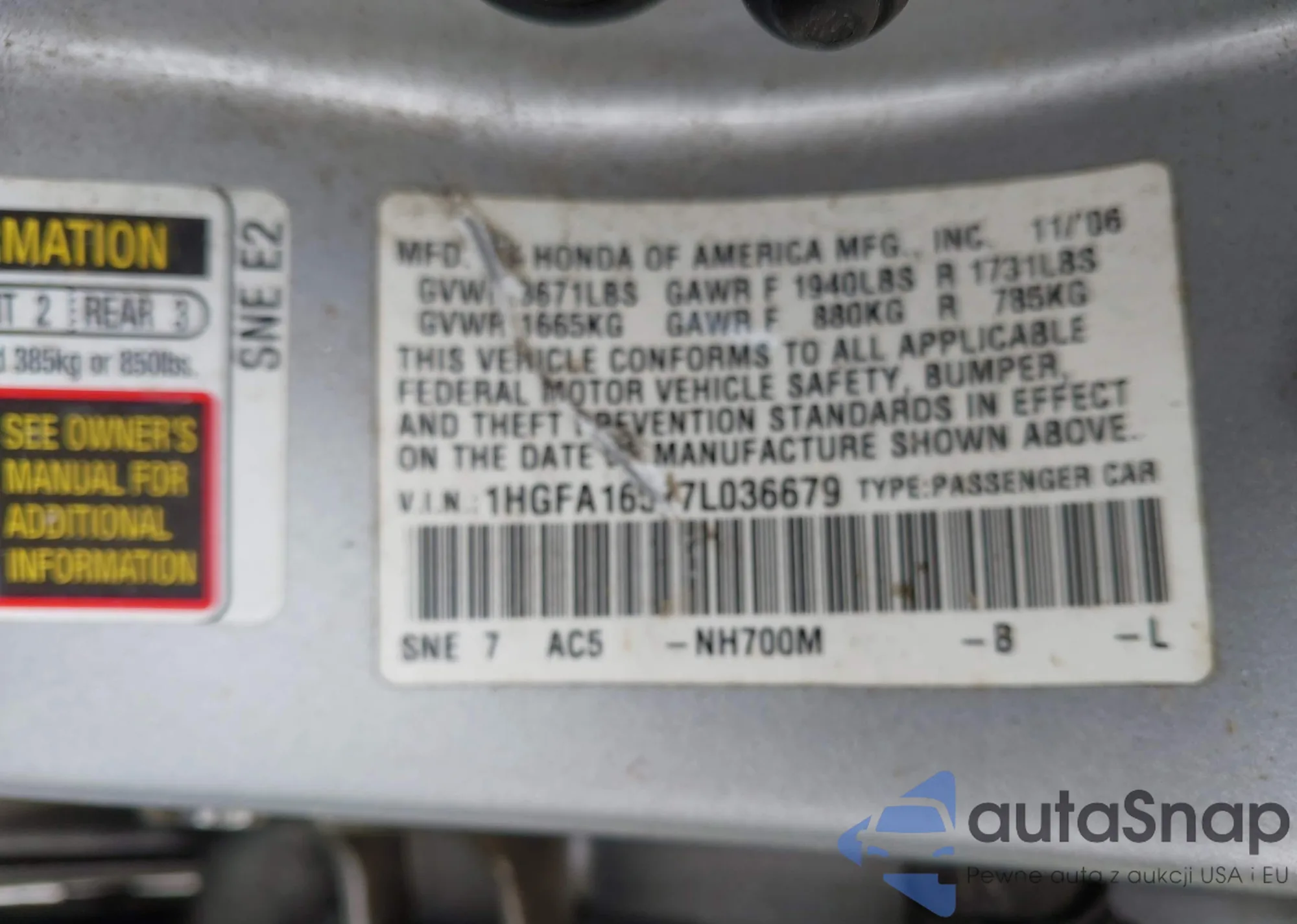 LOT: 42753853 VIN: 1HGFA16577L036679