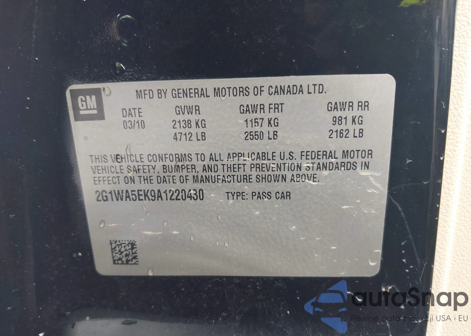 • VIN 2G1WA5EK9A1220430