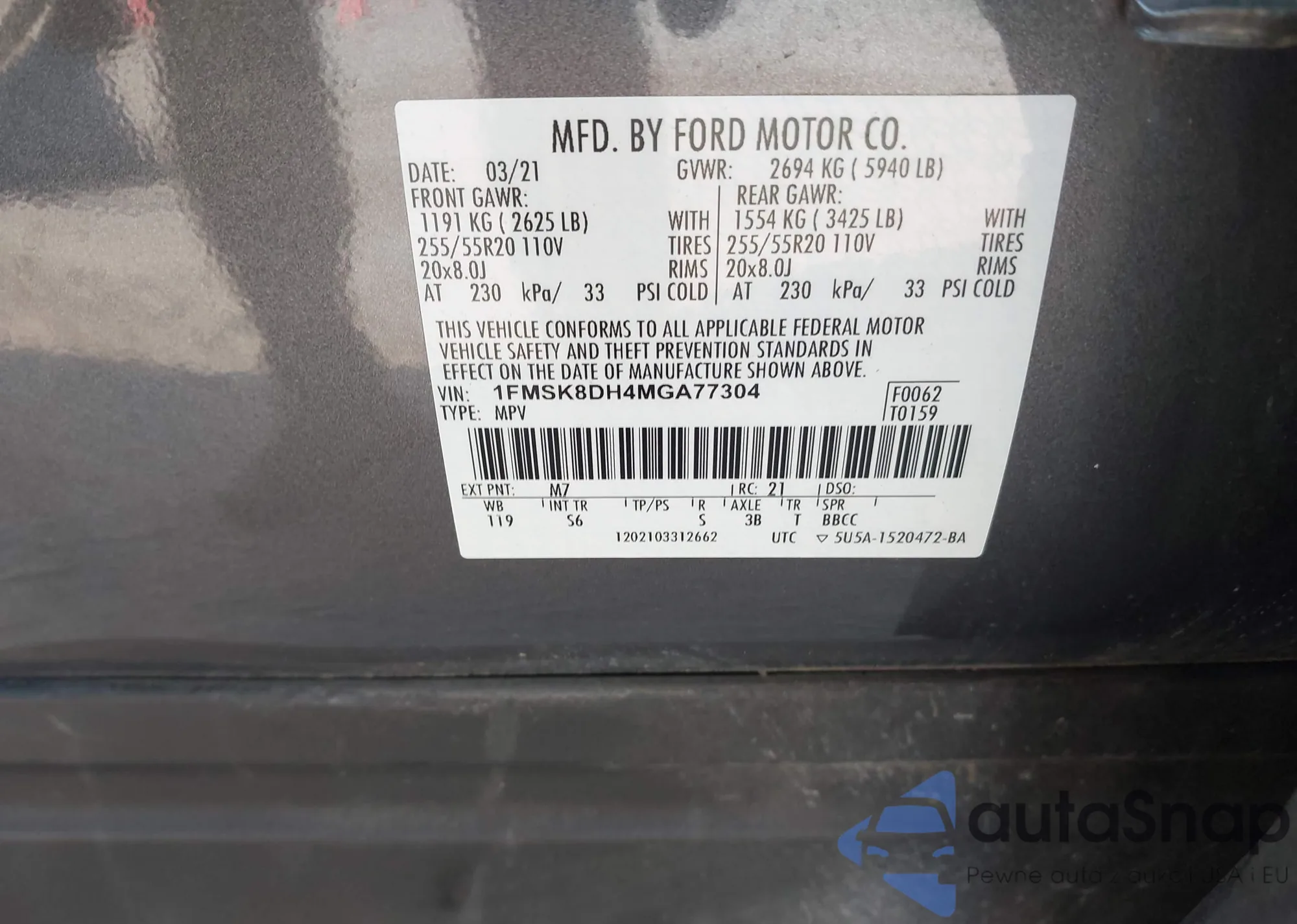 LOT: 43056985 VIN: 1FMHK7D80BGA19224