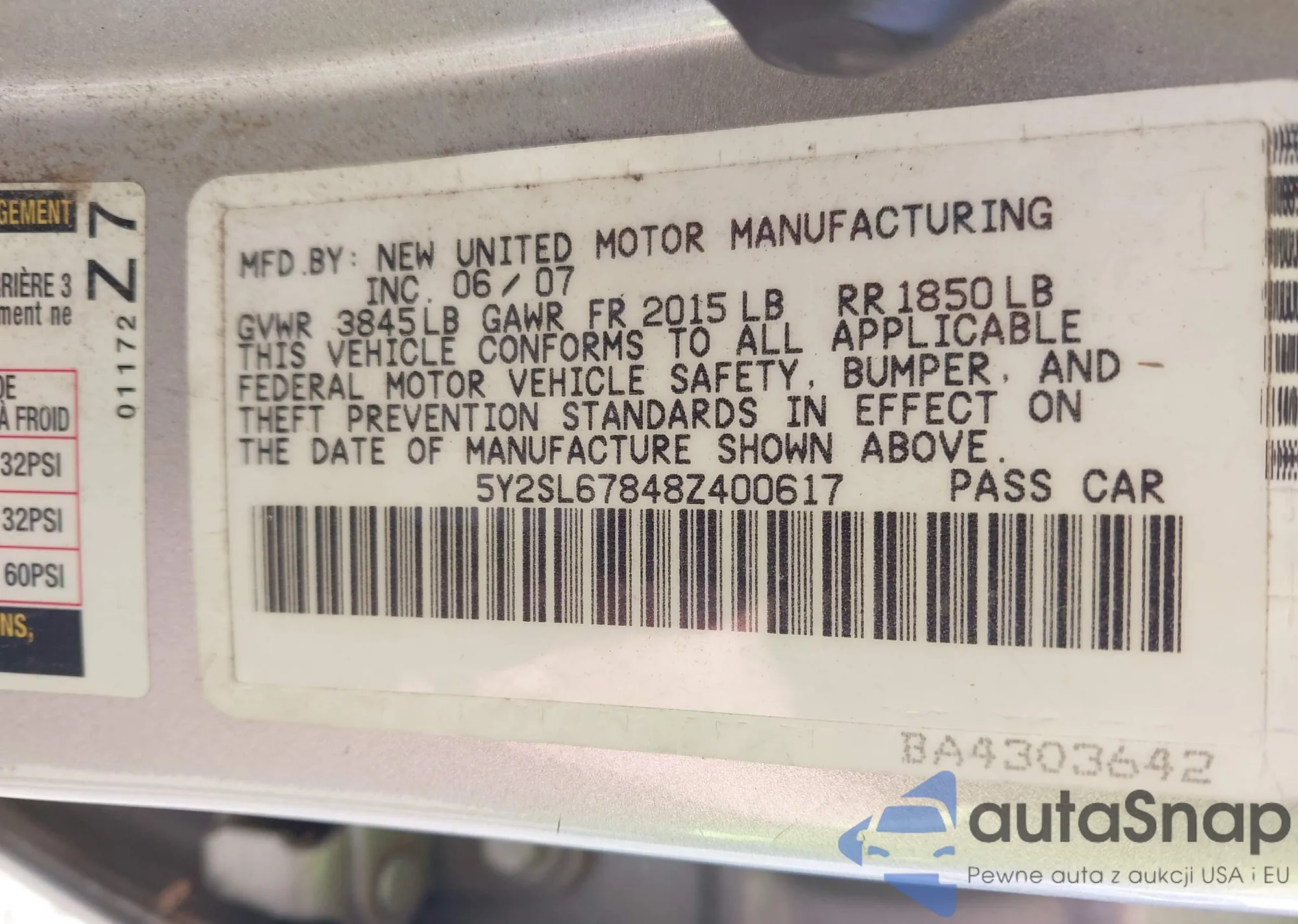 LOT: 43013248 VIN: 5Y2SL67848Z400617