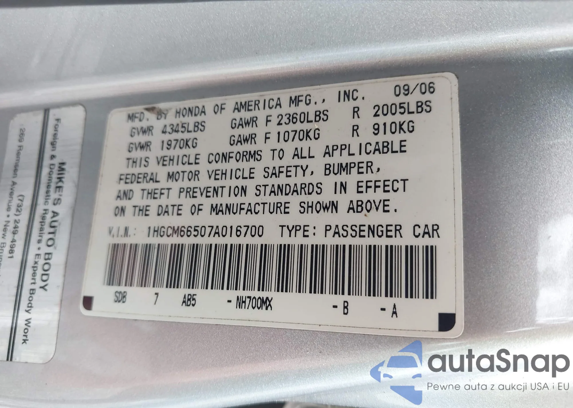 LOT: 43093100 VIN: 1HGCM66507A016700