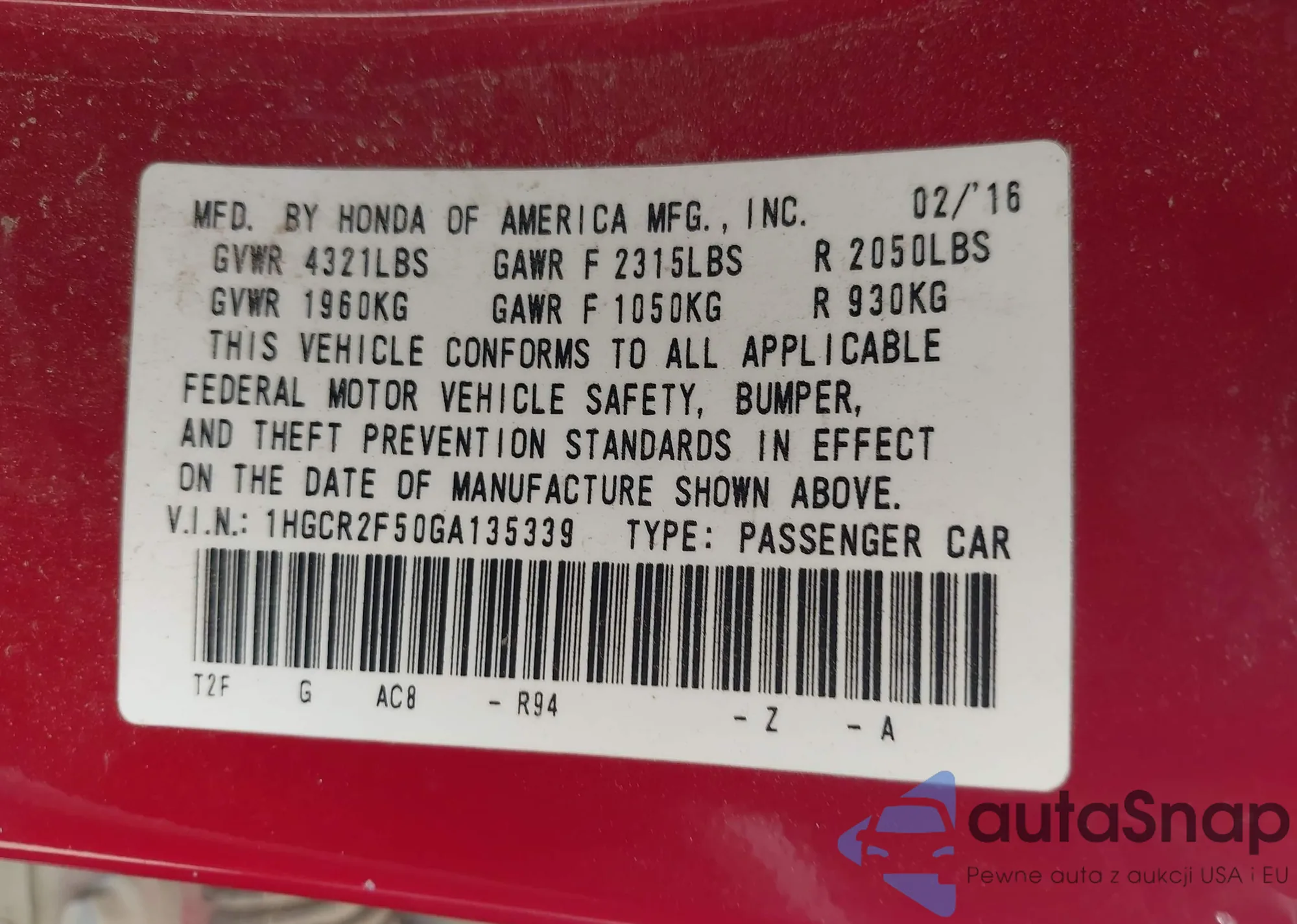 LOT: 43084907 VIN: 1HGCR2F50GA135339