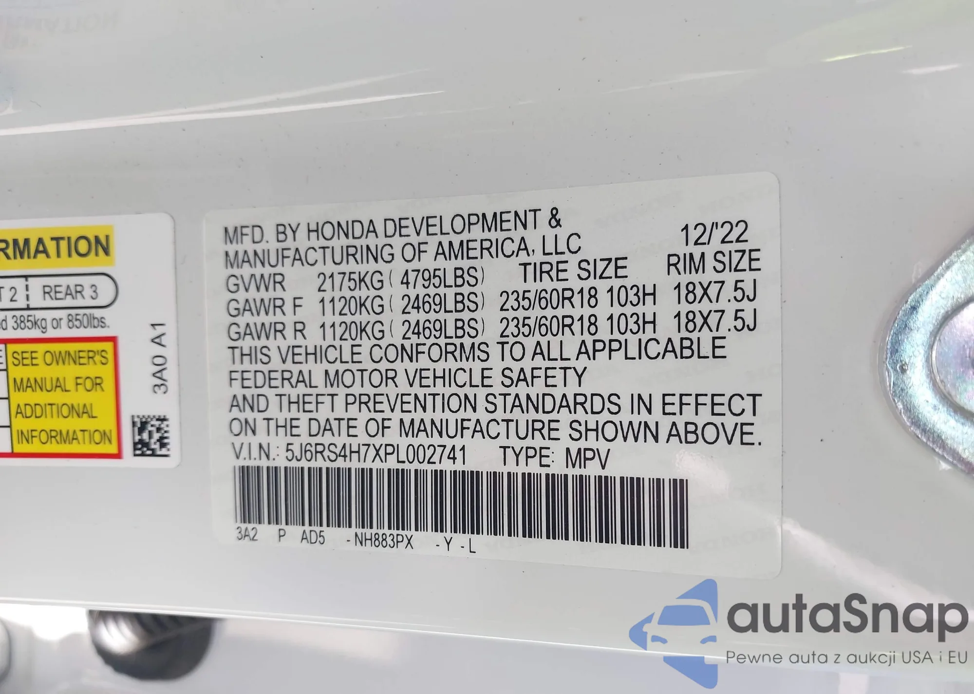 • VIN 5J6RS4H7XPL002741