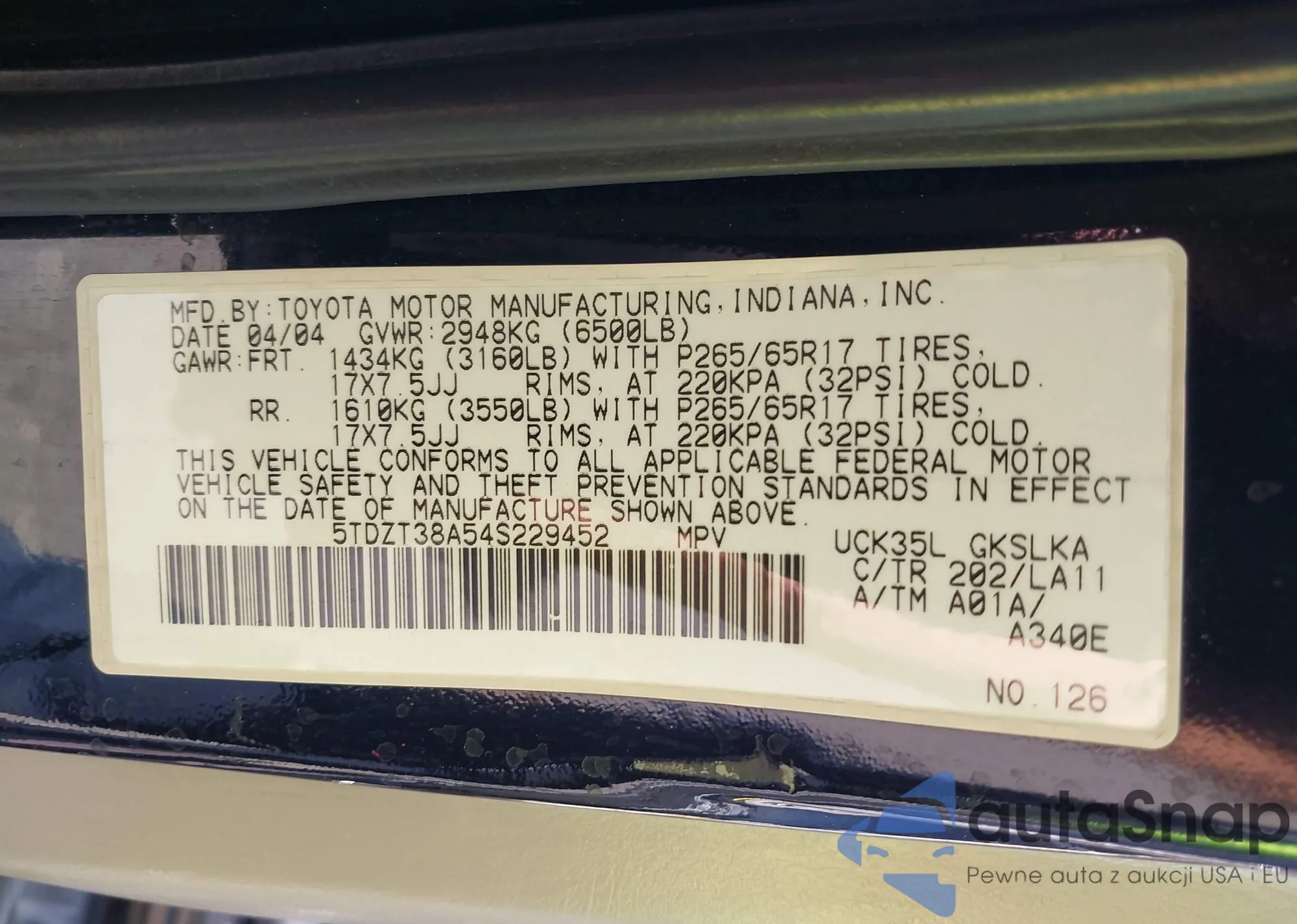 • VIN 5TDZT38A54S229452