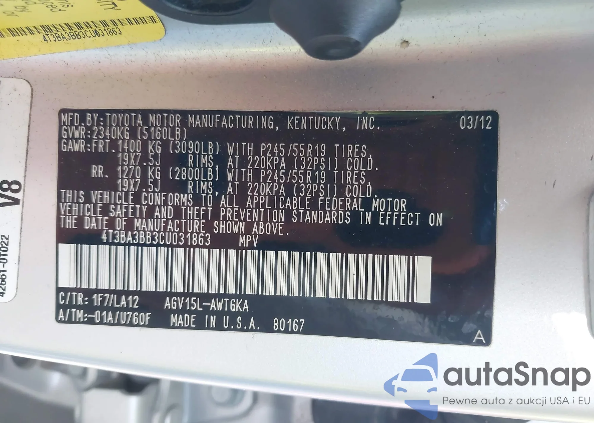 LOT: 43090344 VIN: 4T3BA3BB3CU031863