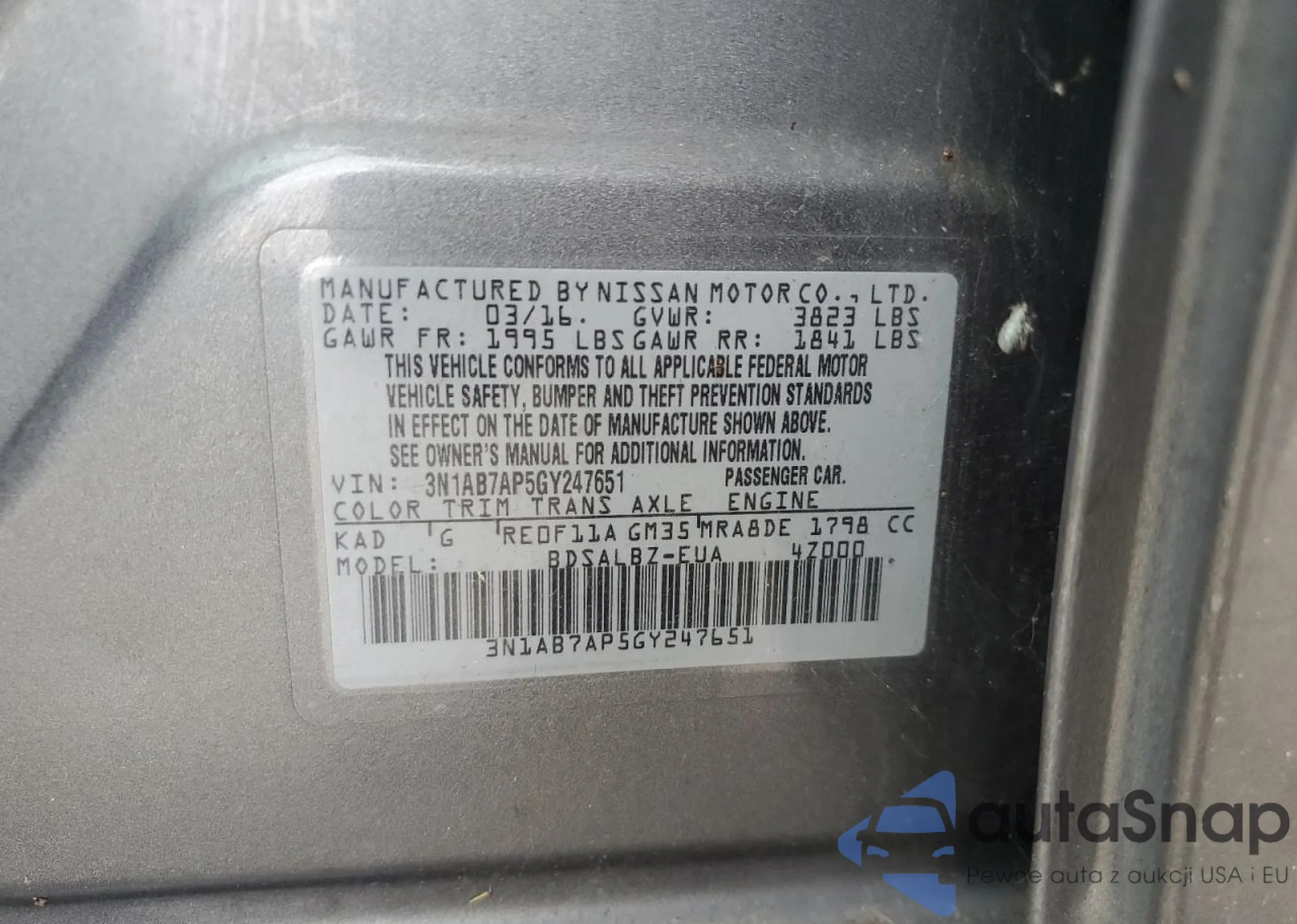 LOT: 68086835 VIN: 3N1AB7AP5GY247651