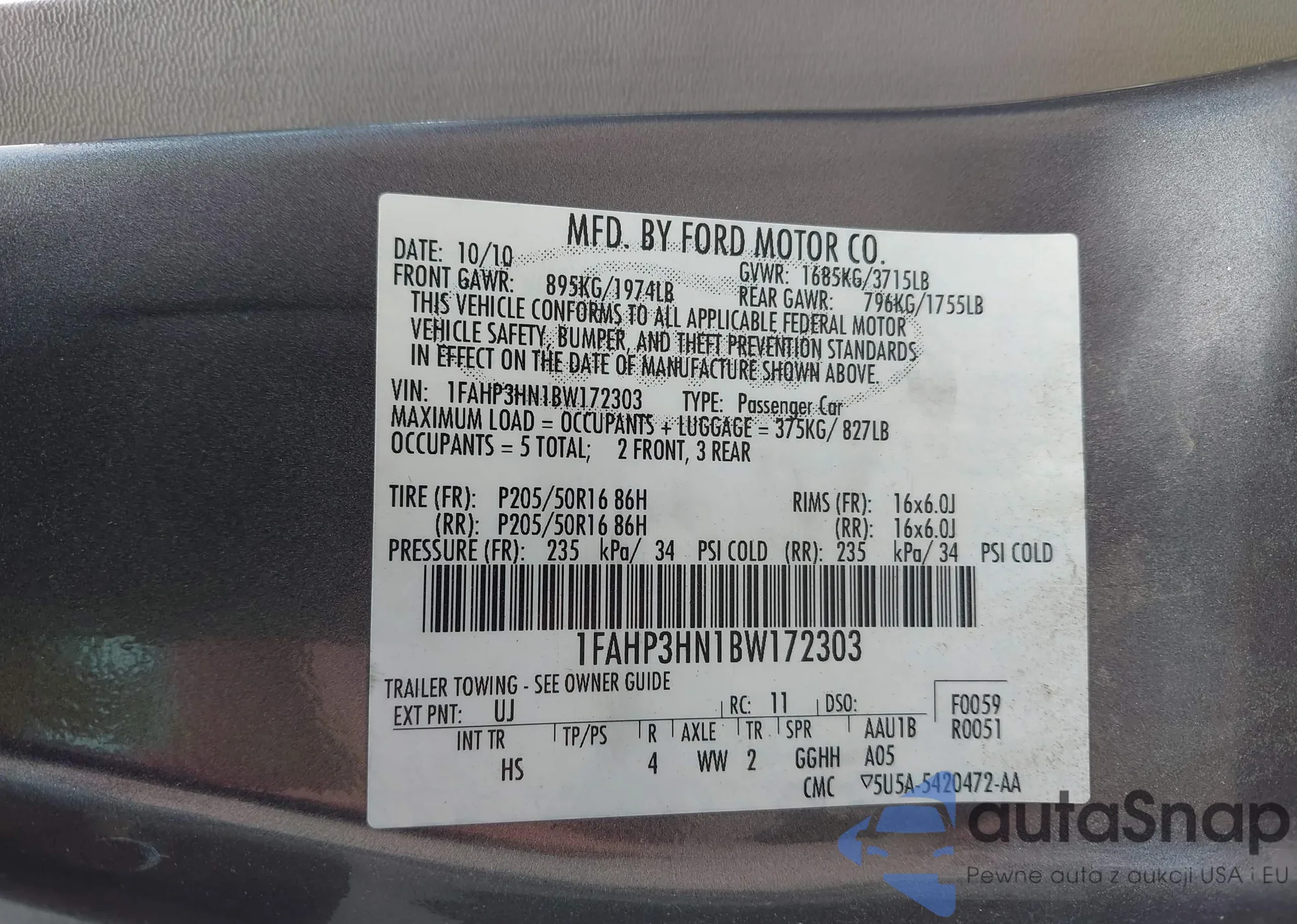 • VIN 1FAHP3HN1BW172303