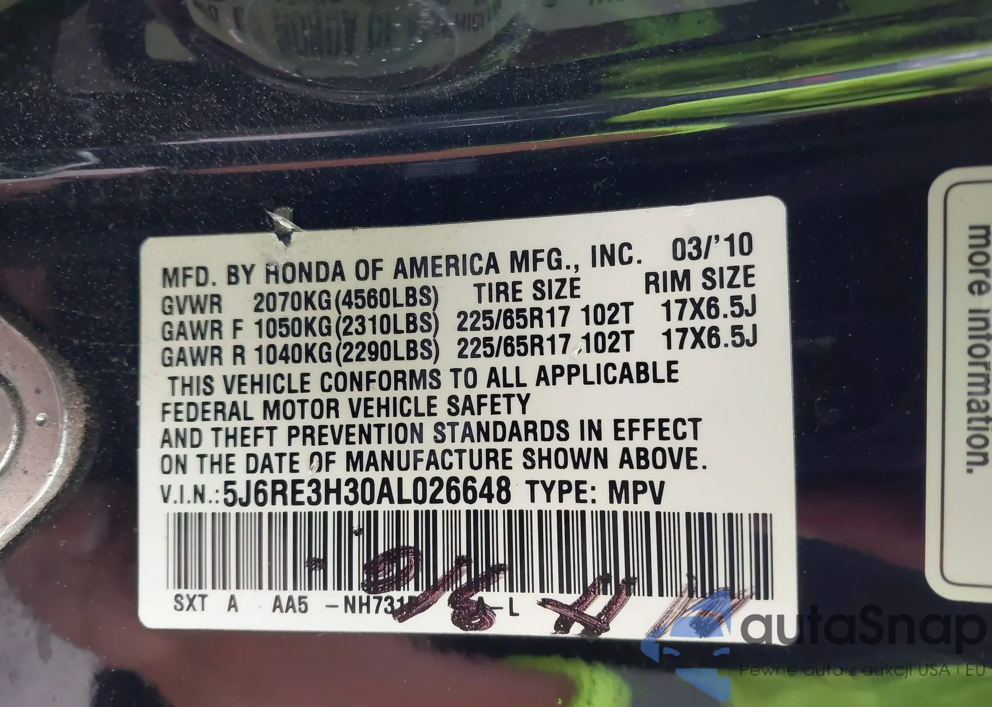 • VIN 5J6RW2H50HL043470
