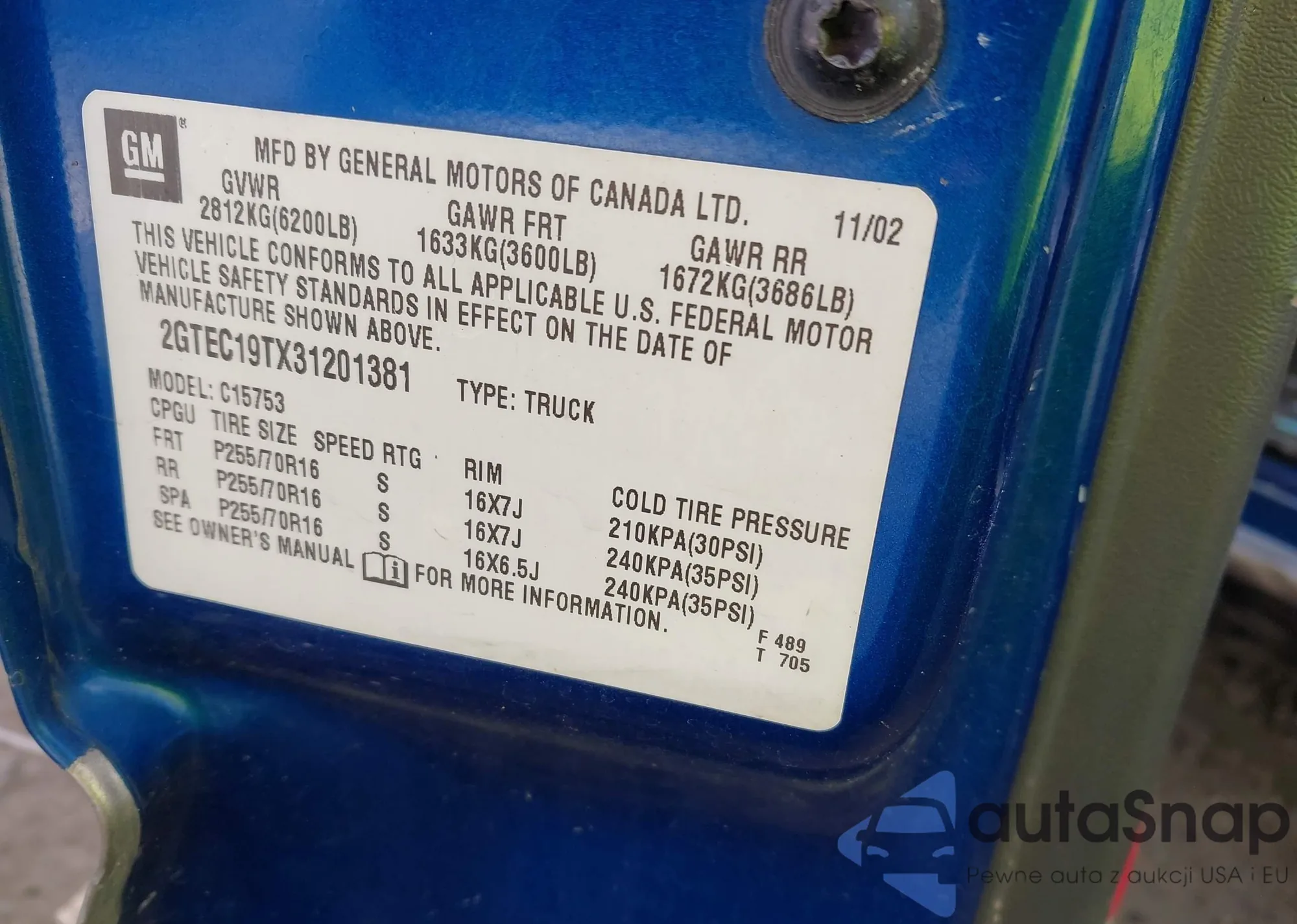 • VIN 2GTEC19TX31201381