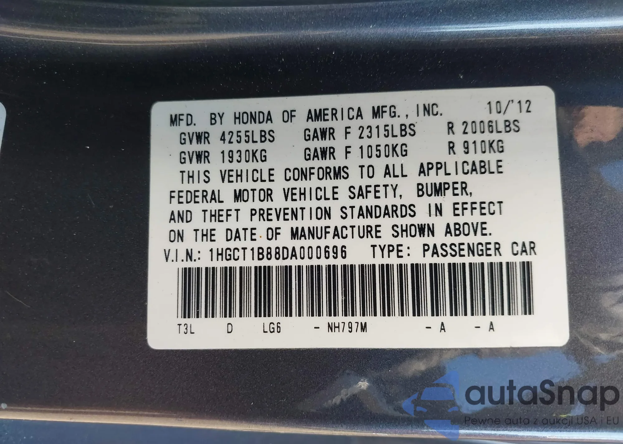 LOT: 42786393 VIN: 1HGCT1B88DA000696