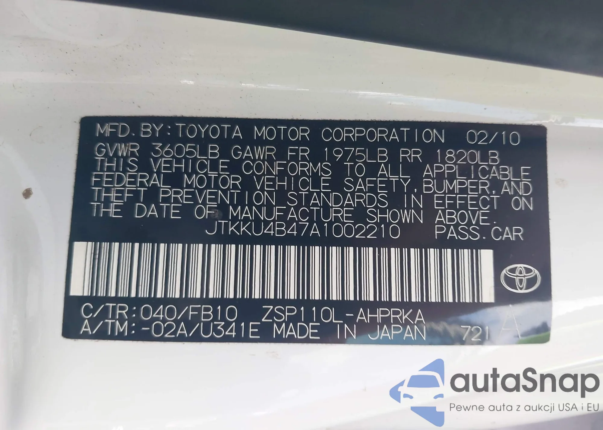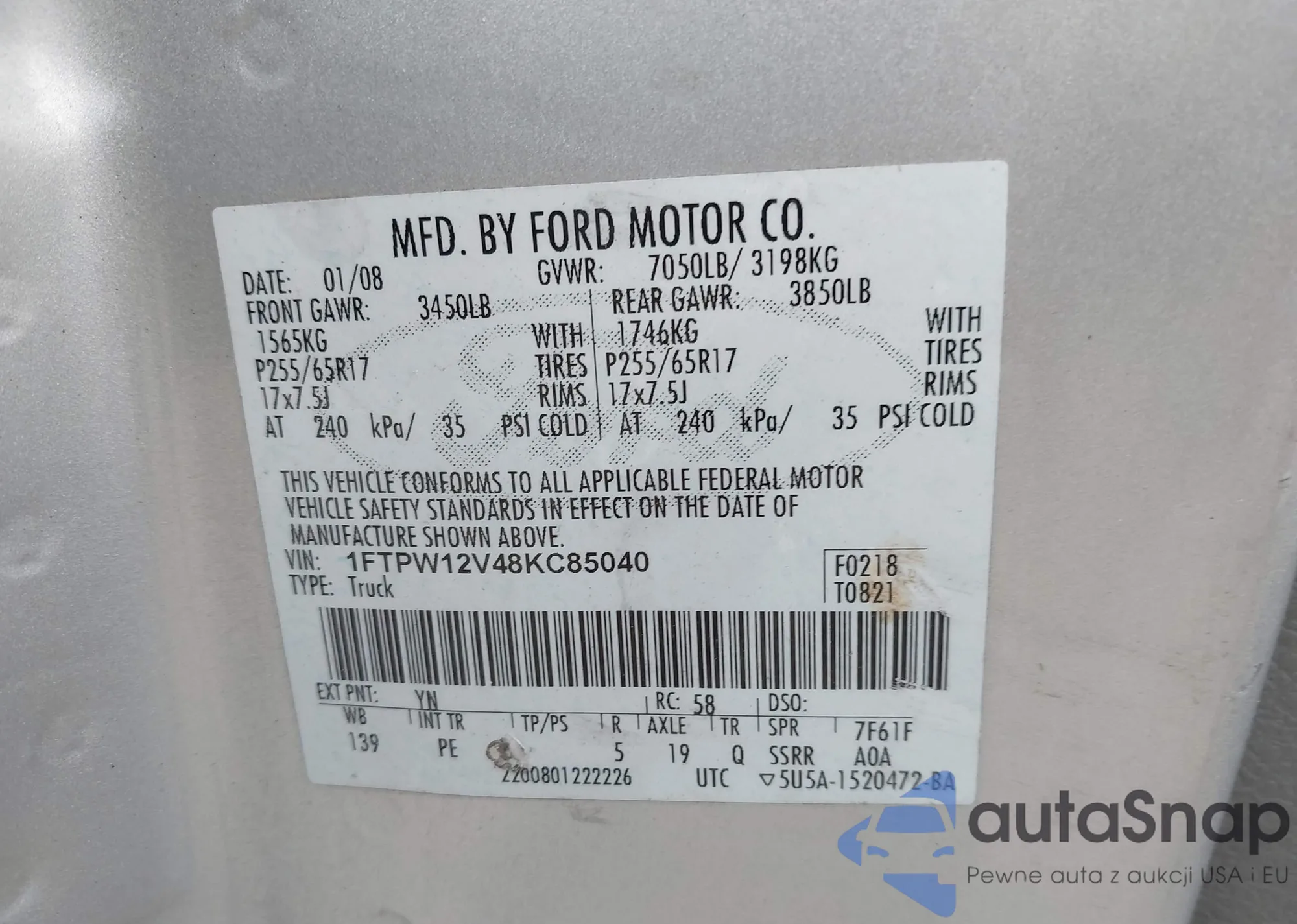 LOT: 42860656 VIN: 1FTPW12V48KC85040