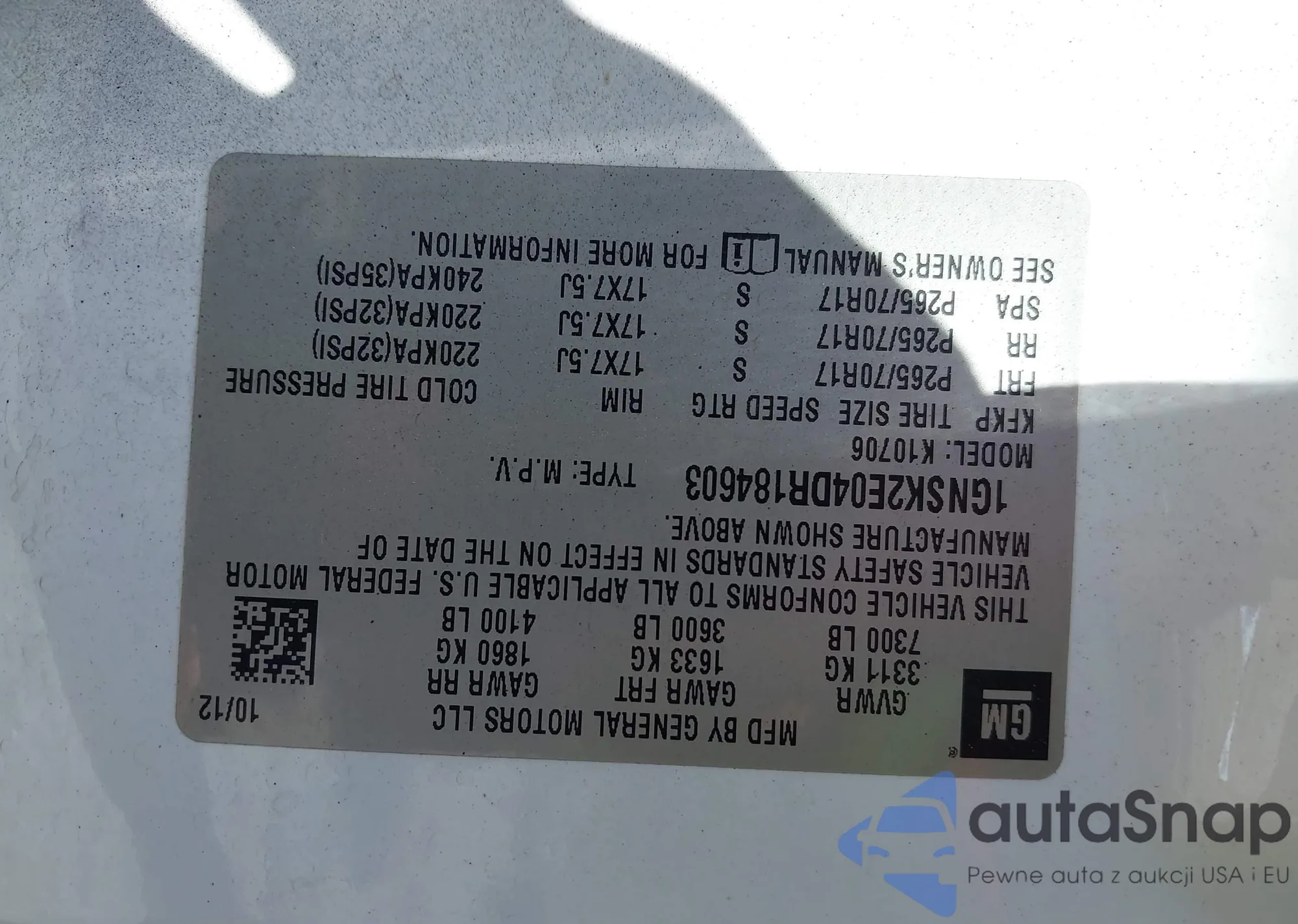 LOT: 42892313 VIN: 1GNSK2E04DR184603