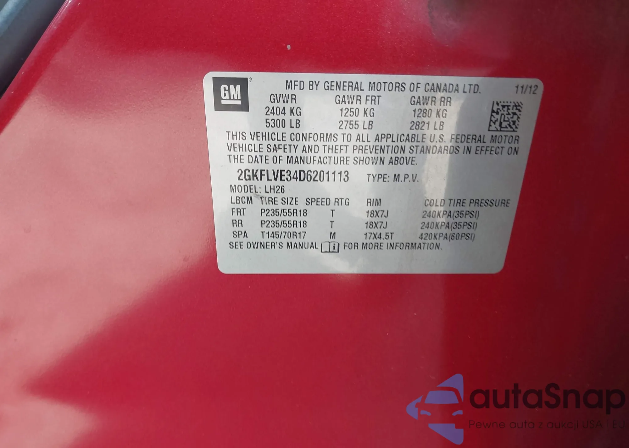 LOT: 42937469 VIN: 2GKFLVE34D6201113