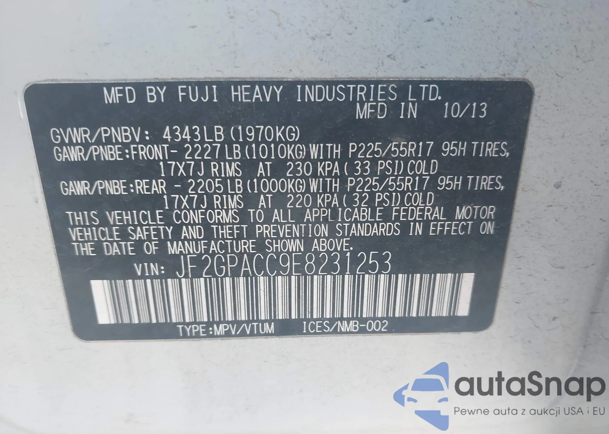 LOT: 43106728 VIN: JF2GPACC9E8231253