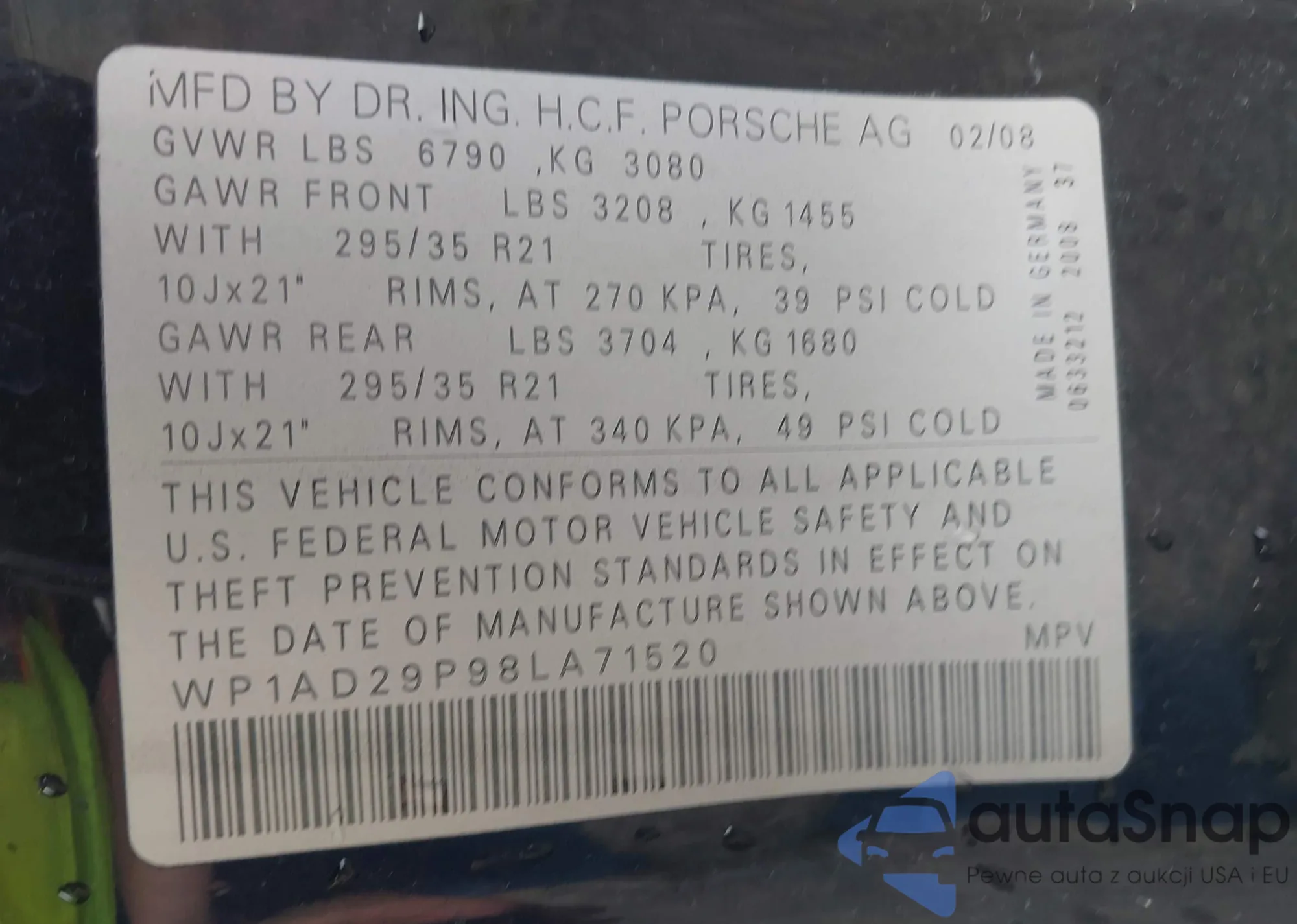 LOT: 42597074 VIN: WP1AD29P98LA71520