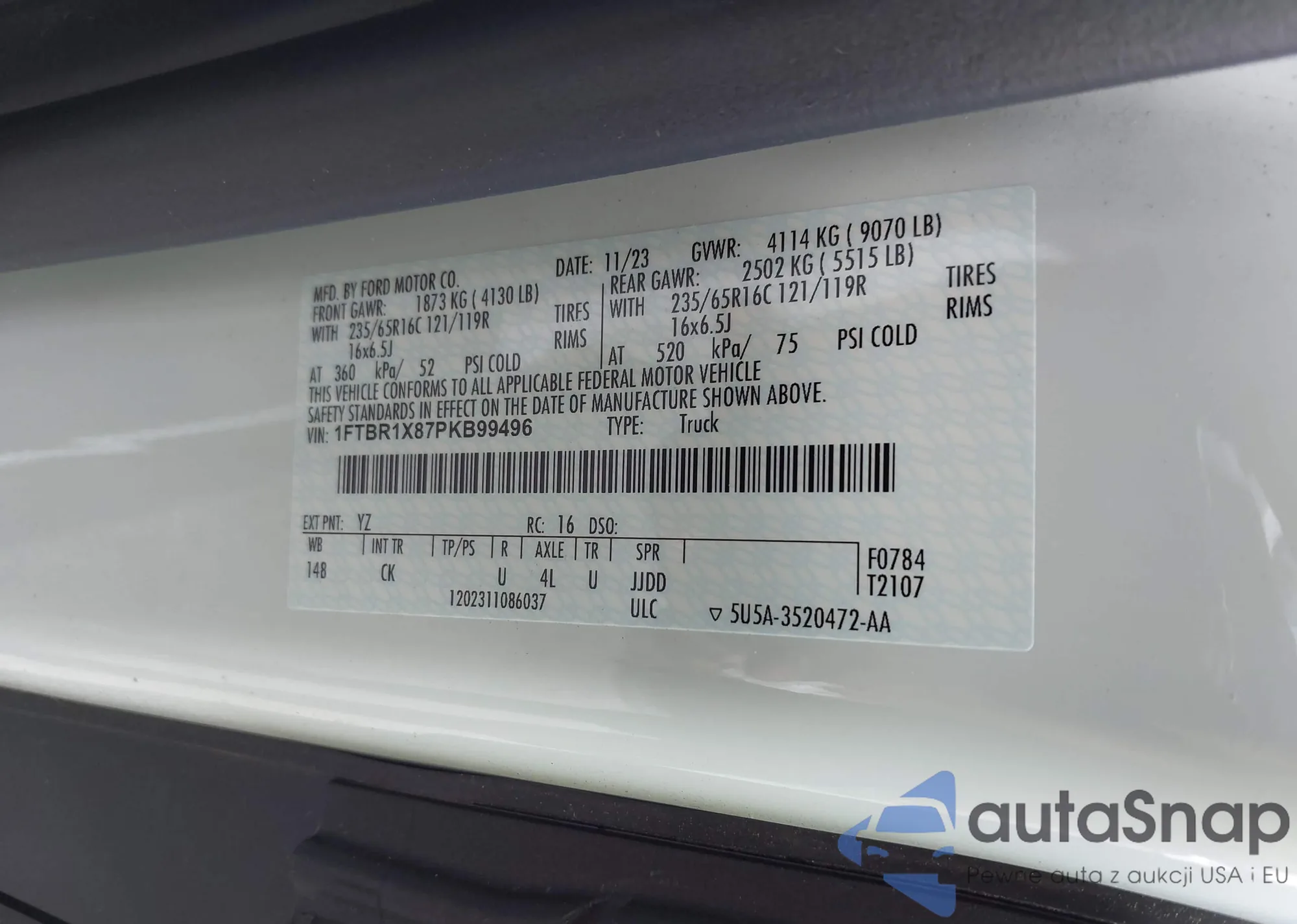 • VIN 1FTBR1X87PKB99496