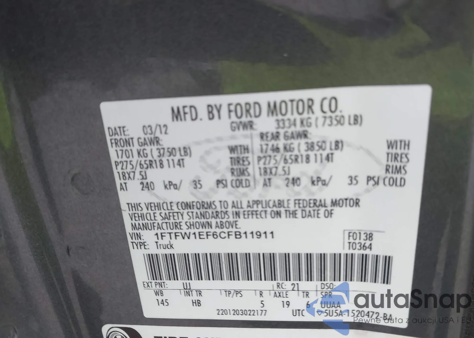 • VIN 1FTFW1EF6CFB11911