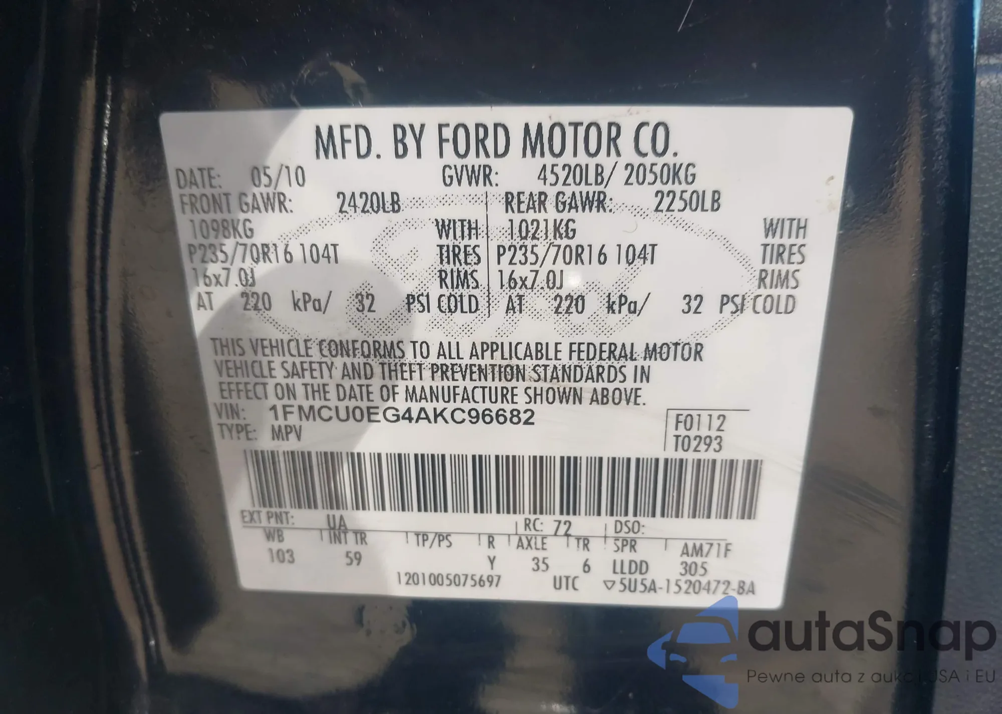 LOT: 41005076 VIN: 1FMCU0EG4AKC96682