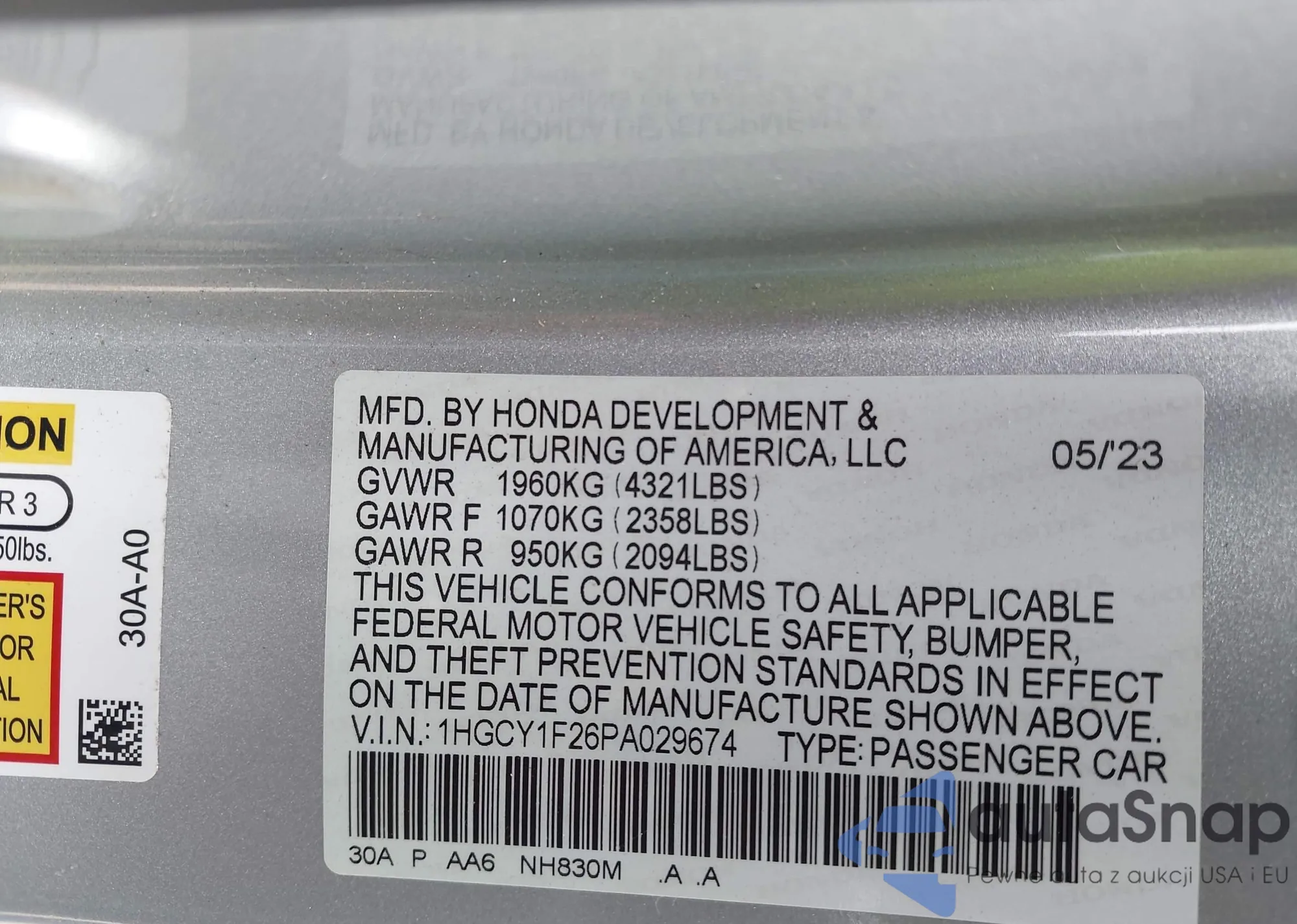 LOT: 43111938 VIN: 1HGCY1F26PA029674